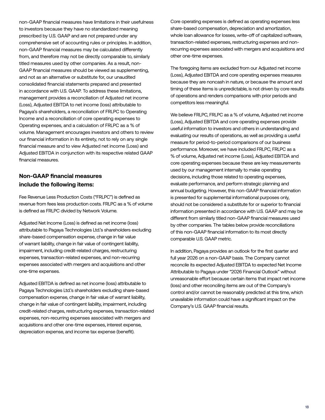 18 non-GAAP financial measures have limitations in their usefulness to investors because they have no standardized meaning prescribed by U.S. GAAP and are not prepared under any comprehensive set of accounting rules or principles. In addition, non-GAAP financial measures may be calculated differently from, and therefore may not be directly comparable to, similarly titled measures used by other companies. As a result, non- GAAP financial measures should be viewed as supplementing, and not as an alternative or substitute for, our unaudited consolidated financial statements prepared and presented in accordance with U.S. GAAP. To address these limitations, management provides a reconciliation of Adjusted net income (Loss), Adjusted EBITDA to net income (loss) attributable to Pagaya’s shareholders, a reconciliation of FRLPC to Operating Income and a reconciliation of core operating expenses to Operating expenses, and a calculation of FRLPC as a % of volume. Management encourages investors and others to review our financial information in its entirety, not to rely on any single financial measure and to view Adjusted net income (Loss) and Adjusted EBITDA in conjunction with its respective related GAAP financial measures. Non-GAAP financial measures include the following items: Fee Revenue Less Production Costs (“FRLPC”) is defined as revenue from fees less production costs. FRLPC as a % of volume is defined as FRLPC divided by Network Volume. Adjusted Net Income (Loss) is defined as net income (loss) attributable to Pagaya Technologies Ltd.’s shareholders excluding share-based compensation expense, change in fair value of warrant liability, change in fair value of contingent liability, impairment, including credit-related charges, restructuring expenses, transaction-related expenses, and non-recurring expenses associated with mergers and acquisitions and other one-time expenses. Adjusted EBITDA is defined as net income (loss) attributable to Pagaya Technologies Ltd.’s shareholders excluding share-based compensation expense, change in fair value of warrant liability, change in fair value of contingent liability, impairment, including credit-related charges, restructuring expenses, transaction-related expenses, non-recurring expenses associated with mergers and acquisitions and other one-time expenses, interest expense, depreciation expense, and income tax expense (benefit). Core operating expenses is defined as operating expenses less share-based compensation, depreciation and amortization, whole loan allowance for losses, write-off of capitalized software, transaction-related expenses, restructuring expenses and non- recurring expenses associated with mergers and acquisitions and other one-time expenses. The foregoing items are excluded from our Adjusted net income (Loss), Adjusted EBITDA and core operating expenses measures because they are noncash in nature, or because the amount and timing of these items is unpredictable, is not driven by core results of operations and renders comparisons with prior periods and competitors less meaningful. We believe FRLPC, FRLPC as a % of volume, Adjusted net income (Loss), Adjusted EBITDA and core operating expenses provide useful information to investors and others in understanding and evaluating our results of operations, as well as providing a useful measure for period-to-period comparisons of our business performance. Moreover, we have included FRLPC, FRLPC as a % of volume, Adjusted net income (Loss), Adjusted EBITDA and core operating expenses because these are key measurements used by our management internally to make operating decisions, including those related to operating expenses, evaluate performance, and perform strategic planning and annual budgeting. However, this non-GAAP financial information is presented for supplemental informational purposes only, should not be considered a substitute for or superior to financial information presented in accordance with U.S. GAAP and may be different from similarly titled non-GAAP financial measures used by other companies. The tables below provide reconciliations of this non-GAAP financial information to its most directly comparable U.S. GAAP metric. In addition, Pagaya provides an outlook for the first quarter and full year 2026 on a non-GAAP basis. The Company cannot reconcile its expected Adjusted EBITDA to expected Net Income Attributable to Pagaya under “2026 Financial Outlook” without unreasonable effort because certain items that impact net income (loss) and other reconciling items are out of the Company’s control and/or cannot be reasonably predicted at this time, which unavailable information could have a significant impact on the Company’s U.S. GAAP financial results.