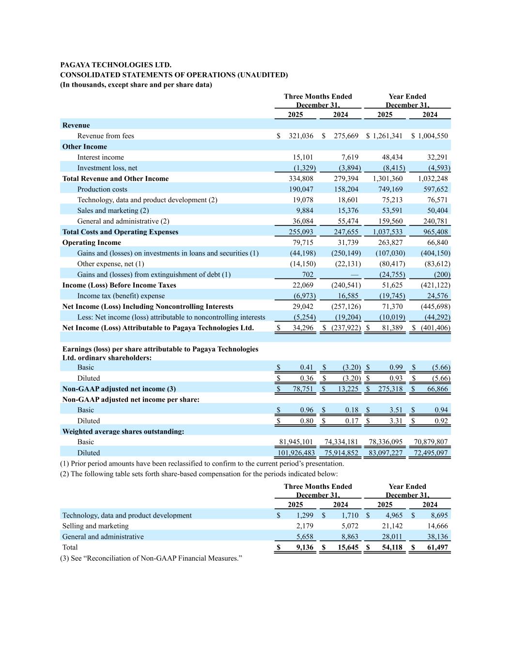 PAGAYA TECHNOLOGIES LTD. CONSOLIDATED STATEMENTS OF OPERATIONS (UNAUDITED) (In thousands, except share and per share data) Three Months Ended December 31, Year Ended December 31, 2025 2024 2025 2024 Revenue Revenue from fees $ 321,036 $ 275,669 $ 1,261,341 $ 1,004,550 Other Income Interest income 15,101 7,619 48,434 32,291 Investment loss, net (1,329) (3,894) (8,415) (4,593) Total Revenue and Other Income 334,808 279,394 1,301,360 1,032,248 Production costs 190,047 158,204 749,169 597,652 Technology, data and product development (2) 19,078 18,601 75,213 76,571 Sales and marketing (2) 9,884 15,376 53,591 50,404 General and administrative (2) 36,084 55,474 159,560 240,781 Total Costs and Operating Expenses 255,093 247,655 1,037,533 965,408 Operating Income 79,715 31,739 263,827 66,840 Gains and (losses) on investments in loans and securities (1) (44,198) (250,149) (107,030) (404,150) Other expense, net (1) (14,150) (22,131) (80,417) (83,612) Gains and (losses) from extinguishment of debt (1) 702 — (24,755) (200) Income (Loss) Before Income Taxes 22,069 (240,541) 51,625 (421,122) Income tax (benefit) expense (6,973) 16,585 (19,745) 24,576 Net Income (Loss) Including Noncontrolling Interests 29,042 (257,126) 71,370 (445,698) Less: Net income (loss) attributable to noncontrolling interests (5,254) (19,204) (10,019) (44,292) Net Income (Loss) Attributable to Pagaya Technologies Ltd. $ 34,296 $ (237,922) $ 81,389 $ (401,406) Earnings (loss) per share attributable to Pagaya Technologies Ltd. ordinary shareholders: Basic $ 0.41 $ (3.20) $ 0.99 $ (5.66) Diluted $ 0.36 $ (3.20) $ 0.93 $ (5.66) Non-GAAP adjusted net income (3) $ 78,751 $ 13,225 $ 275,318 $ 66,866 Non-GAAP adjusted net income per share: Basic $ 0.96 $ 0.18 $ 3.51 $ 0.94 Diluted $ 0.80 $ 0.17 $ 3.31 $ 0.92 Weighted average shares outstanding: Basic 81,945,101 74,334,181 78,336,095 70,879,807 Diluted 101,926,483 75,914,852 83,097,227 72,495,097 (1) Prior period amounts have been reclassified to confirm to the current period’s presentation. (2) The following table sets forth share-based compensation for the periods indicated below: Three Months Ended December 31, Year Ended December 31, 2025 2024 2025 2024 Technology, data and product development $ 1,299 $ 1,710 $ 4,965 $ 8,695 Selling and marketing 2,179 5,072 21,142 14,666 General and administrative 5,658 8,863 28,011 38,136 Total $ 9,136 $ 15,645 $ 54,118 $ 61,497 (3) See “Reconciliation of Non-GAAP Financial Measures.”