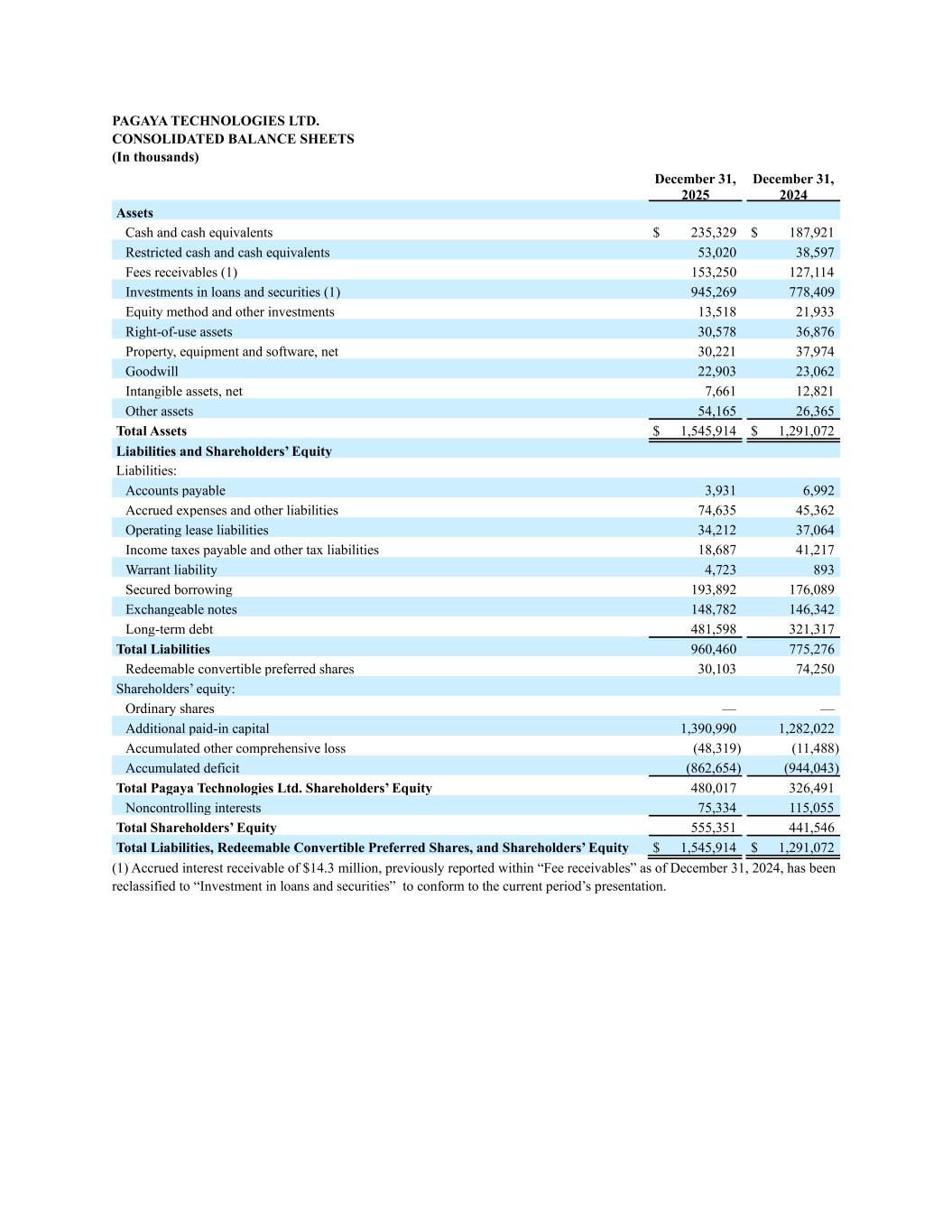 PAGAYA TECHNOLOGIES LTD. CONSOLIDATED BALANCE SHEETS (In thousands) December 31, 2025 December 31, 2024 Assets Cash and cash equivalents $ 235,329 $ 187,921 Restricted cash and cash equivalents 53,020 38,597 Fees receivables (1) 153,250 127,114 Investments in loans and securities (1) 945,269 778,409 Equity method and other investments 13,518 21,933 Right-of-use assets 30,578 36,876 Property, equipment and software, net 30,221 37,974 Goodwill 22,903 23,062 Intangible assets, net 7,661 12,821 Other assets 54,165 26,365 Total Assets $ 1,545,914 $ 1,291,072 Liabilities and Shareholders’ Equity Liabilities: Accounts payable 3,931 6,992 Accrued expenses and other liabilities 74,635 45,362 Operating lease liabilities 34,212 37,064 Income taxes payable and other tax liabilities 18,687 41,217 Warrant liability 4,723 893 Secured borrowing 193,892 176,089 Exchangeable notes 148,782 146,342 Long-term debt 481,598 321,317 Total Liabilities 960,460 775,276 Redeemable convertible preferred shares 30,103 74,250 Shareholders’ equity: Ordinary shares — — Additional paid-in capital 1,390,990 1,282,022 Accumulated other comprehensive loss (48,319) (11,488) Accumulated deficit (862,654) (944,043) Total Pagaya Technologies Ltd. Shareholders’ Equity 480,017 326,491 Noncontrolling interests 75,334 115,055 Total Shareholders’ Equity 555,351 441,546 Total Liabilities, Redeemable Convertible Preferred Shares, and Shareholders’ Equity $ 1,545,914 $ 1,291,072 (1) Accrued interest receivable of $14.3 million, previously reported within “Fee receivables” as of December 31, 2024, has been reclassified to “Investment in loans and securities” to conform to the current period’s presentation.