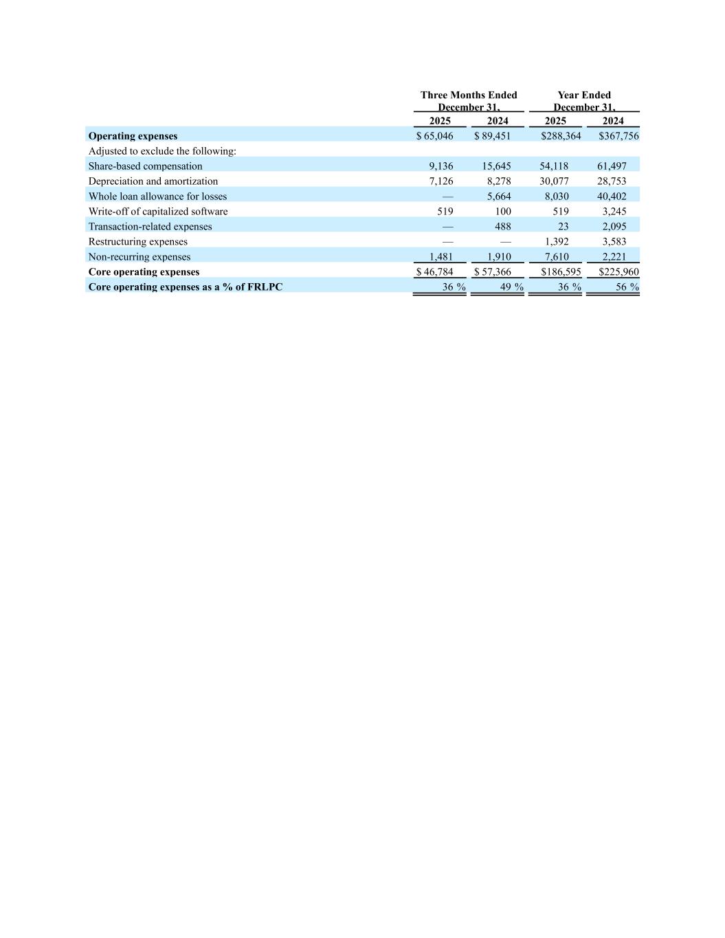 Three Months Ended December 31, Year Ended December 31, 2025 2024 2025 2024 Operating expenses $ 65,046 $ 89,451 $288,364 $367,756 Adjusted to exclude the following: Share-based compensation 9,136 15,645 54,118 61,497 Depreciation and amortization 7,126 8,278 30,077 28,753 Whole loan allowance for losses — 5,664 8,030 40,402 Write-off of capitalized software 519 100 519 3,245 Transaction-related expenses — 488 23 2,095 Restructuring expenses — — 1,392 3,583 Non-recurring expenses 1,481 1,910 7,610 2,221 Core operating expenses $ 46,784 $ 57,366 $186,595 $225,960 Core operating expenses as a % of FRLPC 36 % 49 % 36 % 56 %