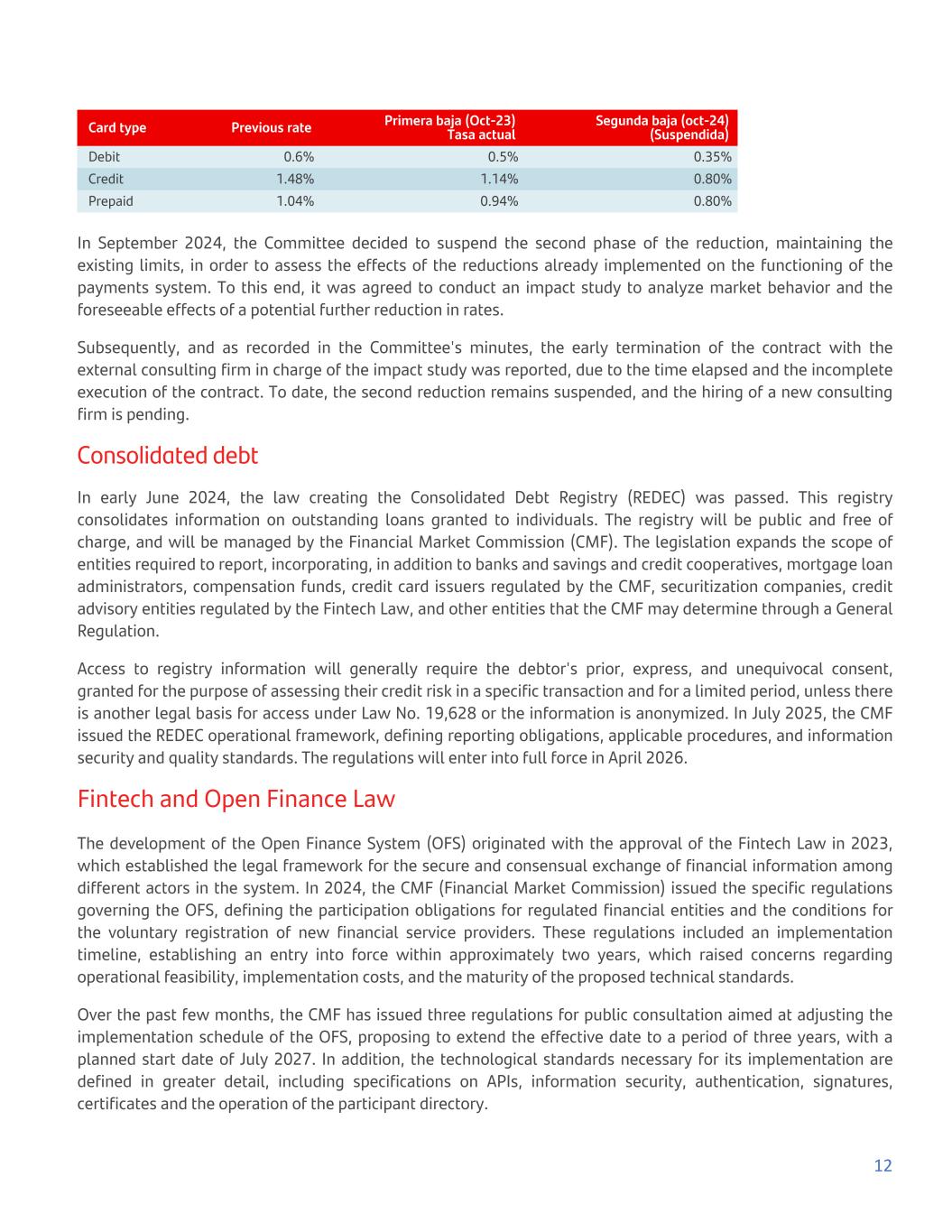 Card type Previous rate Primera baja (Oct-23) Tasa actual Segunda baja (oct-24) (Suspendida) Debit 0.6% 0.5% 0.35% Credit 1.48% 1.14% 0.80% Prepaid 1.04% 0.94% 0.80% In September 2024, the Committee decided to suspend the second phase of the reduction, maintaining the existing limits, in order to assess the effects of the reductions already implemented on the functioning of the payments system. To this end, it was agreed to conduct an impact study to analyze market behavior and the foreseeable effects of a potential further reduction in rates. Subsequently, and as recorded in the Committee's minutes, the early termination of the contract with the external consulting firm in charge of the impact study was reported, due to the time elapsed and the incomplete execution of the contract. To date, the second reduction remains suspended, and the hiring of a new consulting firm is pending. Consolidated debt In early June 2024, the law creating the Consolidated Debt Registry (REDEC) was passed. This registry consolidates information on outstanding loans granted to individuals. The registry will be public and free of charge, and will be managed by the Financial Market Commission (CMF). The legislation expands the scope of entities required to report, incorporating, in addition to banks and savings and credit cooperatives, mortgage loan administrators, compensation funds, credit card issuers regulated by the CMF, securitization companies, credit advisory entities regulated by the Fintech Law, and other entities that the CMF may determine through a General Regulation. Access to registry information will generally require the debtor's prior, express, and unequivocal consent, granted for the purpose of assessing their credit risk in a specific transaction and for a limited period, unless there is another legal basis for access under Law No. 19,628 or the information is anonymized. In July 2025, the CMF issued the REDEC operational framework, defining reporting obligations, applicable procedures, and information security and quality standards. The regulations will enter into full force in April 2026. Fintech and Open Finance Law The development of the Open Finance System (OFS) originated with the approval of the Fintech Law in 2023, which established the legal framework for the secure and consensual exchange of financial information among different actors in the system. In 2024, the CMF (Financial Market Commission) issued the specific regulations governing the OFS, defining the participation obligations for regulated financial entities and the conditions for the voluntary registration of new financial service providers. These regulations included an implementation timeline, establishing an entry into force within approximately two years, which raised concerns regarding operational feasibility, implementation costs, and the maturity of the proposed technical standards. Over the past few months, the CMF has issued three regulations for public consultation aimed at adjusting the implementation schedule of the OFS, proposing to extend the effective date to a period of three years, with a planned start date of July 2027. In addition, the technological standards necessary for its implementation are defined in greater detail, including specifications on APIs, information security, authentication, signatures, certificates and the operation of the participant directory. 12
