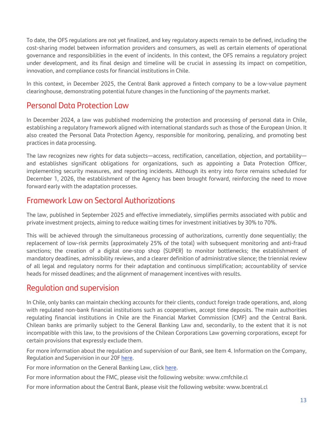 To date, the OFS regulations are not yet finalized, and key regulatory aspects remain to be defined, including the cost-sharing model between information providers and consumers, as well as certain elements of operational governance and responsibilities in the event of incidents. In this context, the OFS remains a regulatory project under development, and its final design and timeline will be crucial in assessing its impact on competition, innovation, and compliance costs for financial institutions in Chile. In this context, in December 2025, the Central Bank approved a fintech company to be a low-value payment clearinghouse, demonstrating potential future changes in the functioning of the payments market. Personal Data Protection Law In December 2024, a law was published modernizing the protection and processing of personal data in Chile, establishing a regulatory framework aligned with international standards such as those of the European Union. It also created the Personal Data Protection Agency, responsible for monitoring, penalizing, and promoting best practices in data processing. The law recognizes new rights for data subjects—access, rectification, cancellation, objection, and portability— and establishes significant obligations for organizations, such as appointing a Data Protection Officer, implementing security measures, and reporting incidents. Although its entry into force remains scheduled for December 1, 2026, the establishment of the Agency has been brought forward, reinforcing the need to move forward early with the adaptation processes. Framework Law on Sectoral Authorizations The law, published in September 2025 and effective immediately, simplifies permits associated with public and private investment projects, aiming to reduce waiting times for investment initiatives by 30% to 70%. This will be achieved through the simultaneous processing of authorizations, currently done sequentially; the replacement of low-risk permits (approximately 25% of the total) with subsequent monitoring and anti-fraud sanctions; the creation of a digital one-stop shop (SUPER) to monitor bottlenecks; the establishment of mandatory deadlines, admissibility reviews, and a clearer definition of administrative silence; the triennial review of all legal and regulatory norms for their adaptation and continuous simplification; accountability of service heads for missed deadlines; and the alignment of management incentives with results. Regulation and supervision In Chile, only banks can maintain checking accounts for their clients, conduct foreign trade operations, and, along with regulated non-bank financial institutions such as cooperatives, accept time deposits. The main authorities regulating financial institutions in Chile are the Financial Market Commission (CMF) and the Central Bank. Chilean banks are primarily subject to the General Banking Law and, secondarily, to the extent that it is not incompatible with this law, to the provisions of the Chilean Corporations Law governing corporations, except for certain provisions that expressly exclude them. For more information about the regulation and supervision of our Bank, see Item 4. Information on the Company, Regulation and Supervision in our 20F here. For more information on the General Banking Law, click here. For more information about the FMC, please visit the following website: www.cmfchile.cl For more information about the Central Bank, please visit the following website: www.bcentral.cl 13