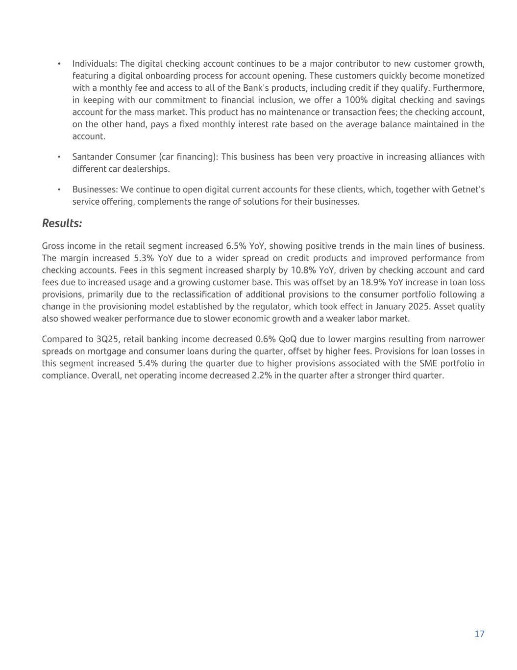 • Individuals: The digital checking account continues to be a major contributor to new customer growth, featuring a digital onboarding process for account opening. These customers quickly become monetized with a monthly fee and access to all of the Bank's products, including credit if they qualify. Furthermore, in keeping with our commitment to financial inclusion, we offer a 100% digital checking and savings account for the mass market. This product has no maintenance or transaction fees; the checking account, on the other hand, pays a fixed monthly interest rate based on the average balance maintained in the account. • Santander Consumer (car financing): This business has been very proactive in increasing alliances with different car dealerships. • Businesses: We continue to open digital current accounts for these clients, which, together with Getnet's service offering, complements the range of solutions for their businesses. Results: Gross income in the retail segment increased 6.5% YoY, showing positive trends in the main lines of business. The margin increased 5.3% YoY due to a wider spread on credit products and improved performance from checking accounts. Fees in this segment increased sharply by 10.8% YoY, driven by checking account and card fees due to increased usage and a growing customer base. This was offset by an 18.9% YoY increase in loan loss provisions, primarily due to the reclassification of additional provisions to the consumer portfolio following a change in the provisioning model established by the regulator, which took effect in January 2025. Asset quality also showed weaker performance due to slower economic growth and a weaker labor market. Compared to 3Q25, retail banking income decreased 0.6% QoQ due to lower margins resulting from narrower spreads on mortgage and consumer loans during the quarter, offset by higher fees. Provisions for loan losses in this segment increased 5.4% during the quarter due to higher provisions associated with the SME portfolio in compliance. Overall, net operating income decreased 2.2% in the quarter after a stronger third quarter. 17