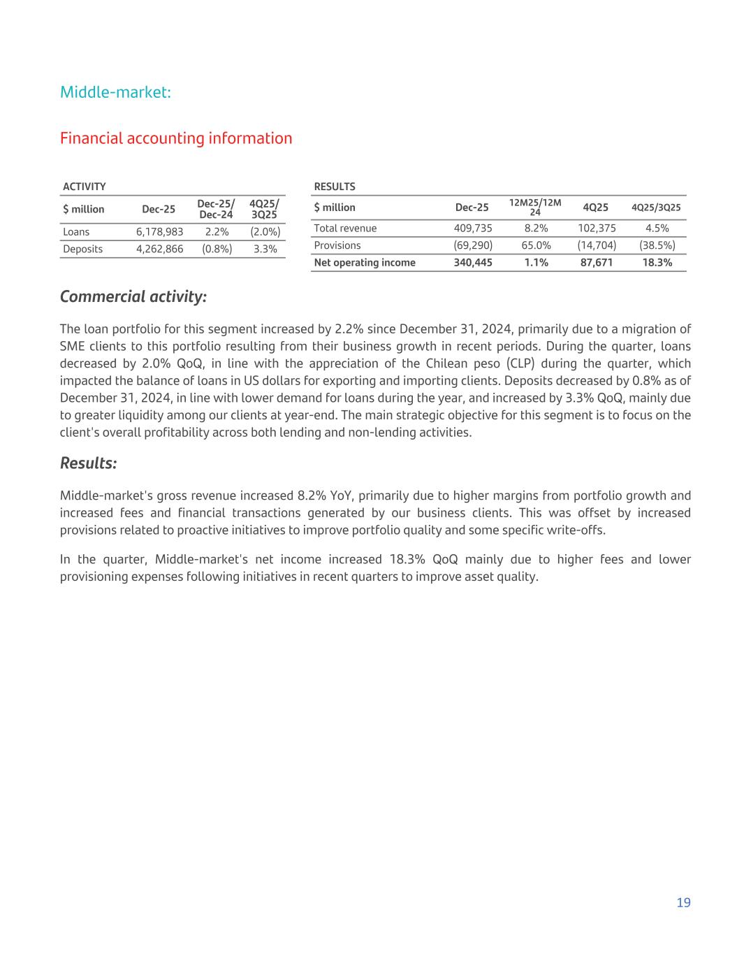 Middle-market: Financial accounting information ACTIVITY $ million Dec-25 Dec-25/ Dec-24 4Q25/ 3Q25 Loans 6,178,983 2.2% (2.0%) Deposits 4,262,866 (0.8%) 3.3% RESULTS $ million Dec-25 12M25/12M 24 4Q25 4Q25/3Q25 Total revenue 409,735 8.2% 102,375 4.5% Provisions (69,290) 65.0% (14,704) (38.5%) Net operating income 340,445 1.1% 87,671 18.3% Commercial activity: The loan portfolio for this segment increased by 2.2% since December 31, 2024, primarily due to a migration of SME clients to this portfolio resulting from their business growth in recent periods. During the quarter, loans decreased by 2.0% QoQ, in line with the appreciation of the Chilean peso (CLP) during the quarter, which impacted the balance of loans in US dollars for exporting and importing clients. Deposits decreased by 0.8% as of December 31, 2024, in line with lower demand for loans during the year, and increased by 3.3% QoQ, mainly due to greater liquidity among our clients at year-end. The main strategic objective for this segment is to focus on the client's overall profitability across both lending and non-lending activities. Results: Middle-market's gross revenue increased 8.2% YoY, primarily due to higher margins from portfolio growth and increased fees and financial transactions generated by our business clients. This was offset by increased provisions related to proactive initiatives to improve portfolio quality and some specific write-offs. In the quarter, Middle-market's net income increased 18.3% QoQ mainly due to higher fees and lower provisioning expenses following initiatives in recent quarters to improve asset quality. 19