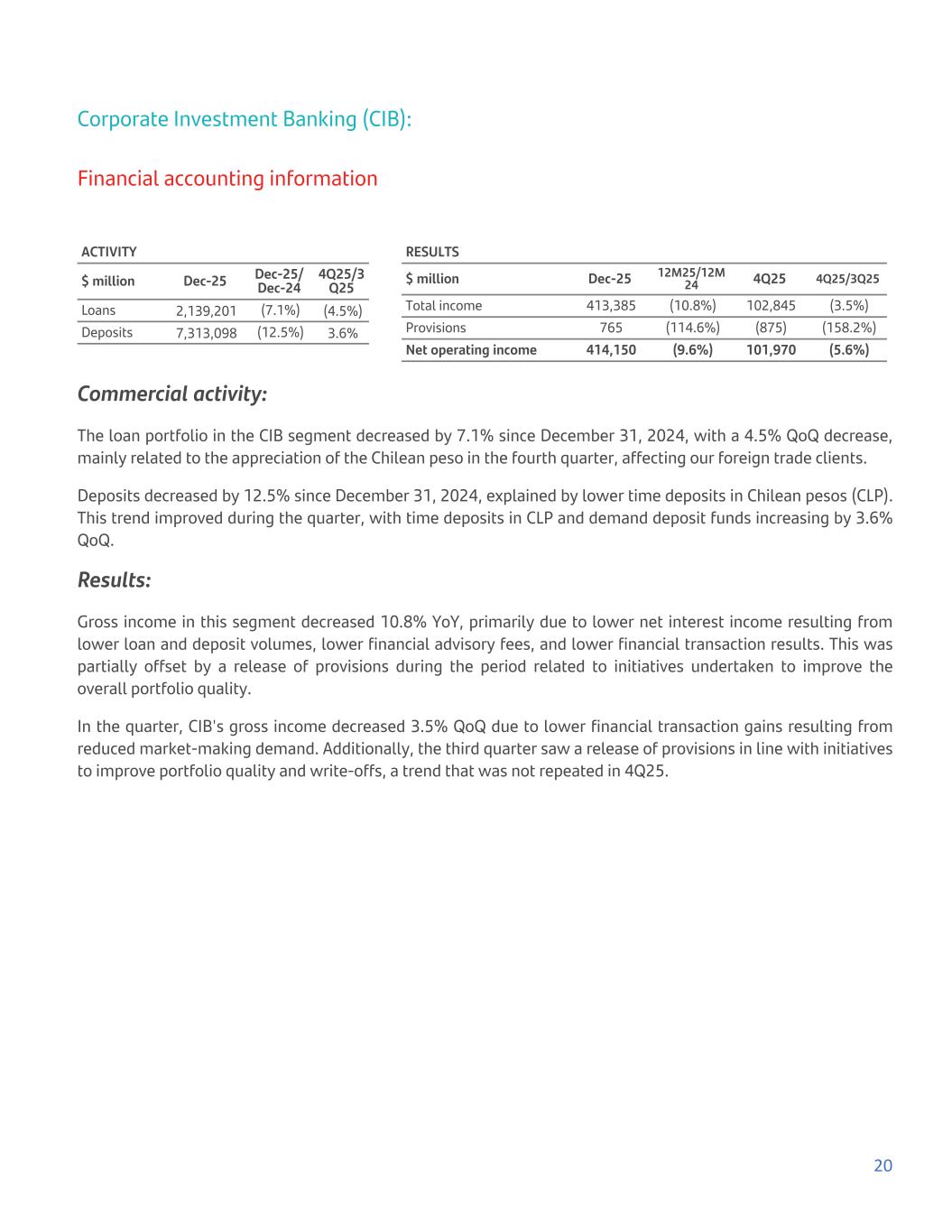 Corporate Investment Banking (CIB): Financial accounting information ACTIVITY $ million Dec-25 Dec-25/ Dec-24 4Q25/3 Q25 Loans 2,139,201 (7.1%) (4.5%) Deposits 7,313,098 (12.5%) 3.6% RESULTS $ million Dec-25 12M25/12M 24 4Q25 4Q25/3Q25 Total income 413,385 (10.8%) 102,845 (3.5%) Provisions 765 (114.6%) (875) (158.2%) Net operating income 414,150 (9.6%) 101,970 (5.6%) Commercial activity: The loan portfolio in the CIB segment decreased by 7.1% since December 31, 2024, with a 4.5% QoQ decrease, mainly related to the appreciation of the Chilean peso in the fourth quarter, affecting our foreign trade clients. Deposits decreased by 12.5% since December 31, 2024, explained by lower time deposits in Chilean pesos (CLP). This trend improved during the quarter, with time deposits in CLP and demand deposit funds increasing by 3.6% QoQ. Results: Gross income in this segment decreased 10.8% YoY, primarily due to lower net interest income resulting from lower loan and deposit volumes, lower financial advisory fees, and lower financial transaction results. This was partially offset by a release of provisions during the period related to initiatives undertaken to improve the overall portfolio quality. In the quarter, CIB's gross income decreased 3.5% QoQ due to lower financial transaction gains resulting from reduced market-making demand. Additionally, the third quarter saw a release of provisions in line with initiatives to improve portfolio quality and write-offs, a trend that was not repeated in 4Q25. 20