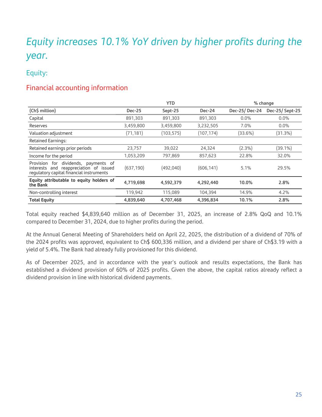 Equity increases 10.1% YoY driven by higher profits during the year. Equity: Financial accounting information YTD % change (Ch$ million) Dec-25 Sept-25 Dec-24 Dec-25/ Dec-24 Dec-25/ Sept-25 Capital 891,303 891,303 891,303 0.0% 0.0% Reserves 3,459,800 3,459,800 3,232,505 7.0% 0.0% Valuation adjustment (71,181) (103,575) (107,174) (33.6%) (31.3%) Retained Earnings: Retained earnings prior periods 23,757 39,022 24,324 (2.3%) (39.1%) Income for the period 1,053,209 797,869 857,623 22.8% 32.0% Provision for dividends, payments of interests and reappreciation of issued regulatory capital financial instruments (637,190) (492,040) (606,141) 5.1% 29.5% Equity attributable to equity holders of the Bank 4,719,698 4,592,379 4,292,440 10.0% 2.8% Non-controlling interest 119,942 115,089 104,394 14.9% 4.2% Total Equity 4,839,640 4,707,468 4,396,834 10.1% 2.8% Total equity reached $4,839,640 million as of December 31, 2025, an increase of 2.8% QoQ and 10.1% compared to December 31, 2024, due to higher profits during the period. At the Annual General Meeting of Shareholders held on April 22, 2025, the distribution of a dividend of 70% of the 2024 profits was approved, equivalent to Ch$ 600,336 million, and a dividend per share of Ch$3.19 with a yield of 5.4%. The Bank had already fully provisioned for this dividend. As of December 2025, and in accordance with the year's outlook and results expectations, the Bank has established a dividend provision of 60% of 2025 profits. Given the above, the capital ratios already reflect a dividend provision in line with historical dividend payments. 25