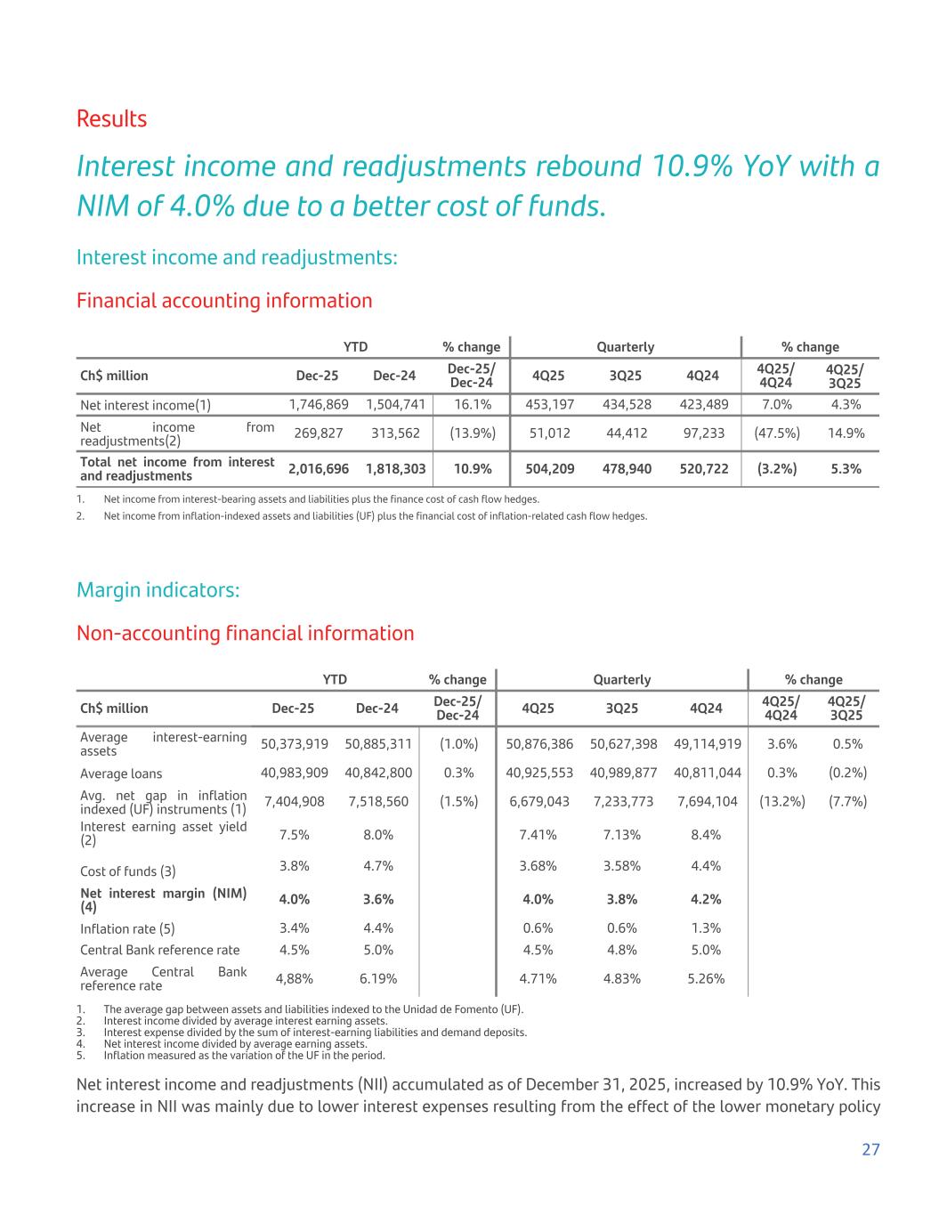 Results Interest income and readjustments rebound 10.9% YoY with a NIM of 4.0% due to a better cost of funds. Interest income and readjustments: Financial accounting information YTD % change Quarterly % change Ch$ million Dec-25 Dec-24 Dec-25/ Dec-24 4Q25 3Q25 4Q24 4Q25/ 4Q24 4Q25/ 3Q25 Net interest income(1) 1,746,869 1,504,741 16.1% 453,197 434,528 423,489 7.0% 4.3% Net income from readjustments(2) 269,827 313,562 (13.9%) 51,012 44,412 97,233 (47.5%) 14.9% Total net income from interest and readjustments 2,016,696 1,818,303 10.9% 504,209 478,940 520,722 (3.2%) 5.3% 1. Net income from interest-bearing assets and liabilities plus the finance cost of cash flow hedges. 2. Net income from inflation-indexed assets and liabilities (UF) plus the financial cost of inflation-related cash flow hedges. Margin indicators: Non-accounting financial information YTD % change Quarterly % change Ch$ million Dec-25 Dec-24 Dec-25/ Dec-24 4Q25 3Q25 4Q24 4Q25/ 4Q24 4Q25/ 3Q25 Average interest-earning assets 50,373,919 50,885,311 (1.0%) 50,876,386 50,627,398 49,114,919 3.6% 0.5% Average loans 40,983,909 40,842,800 0.3% 40,925,553 40,989,877 40,811,044 0.3% (0.2%) Avg. net gap in inflation indexed (UF) instruments (1) 7,404,908 7,518,560 (1.5%) 6,679,043 7,233,773 7,694,104 (13.2%) (7.7%) Interest earning asset yield (2) 7.5% 8.0% 7.41% 7.13% 8.4% Cost of funds (3) 3.8% 4.7% 3.68% 3.58% 4.4% Net interest margin (NIM) (4) 4.0% 3.6% 4.0% 3.8% 4.2% Inflation rate (5) 3.4% 4.4% 0.6% 0.6% 1.3% Central Bank reference rate 4.5% 5.0% 4.5% 4.8% 5.0% Average Central Bank reference rate 4,88% 6.19% 4.71% 4.83% 5.26% 1. The average gap between assets and liabilities indexed to the Unidad de Fomento (UF). 2. Interest income divided by average interest earning assets. 3. Interest expense divided by the sum of interest-earning liabilities and demand deposits. 4. Net interest income divided by average earning assets. 5. Inflation measured as the variation of the UF in the period. Net interest income and readjustments (NII) accumulated as of December 31, 2025, increased by 10.9% YoY. This increase in NII was mainly due to lower interest expenses resulting from the effect of the lower monetary policy 27