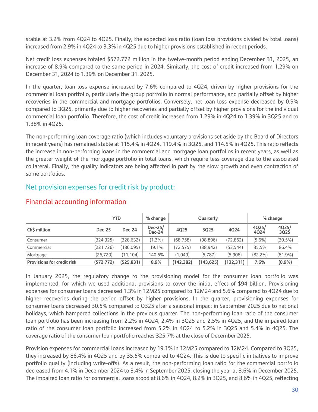 stable at 3.2% from 4Q24 to 4Q25. Finally, the expected loss ratio (loan loss provisions divided by total loans) increased from 2.9% in 4Q24 to 3.3% in 4Q25 due to higher provisions established in recent periods. Net credit loss expenses totaled $572.772 million in the twelve-month period ending December 31, 2025, an increase of 8.9% compared to the same period in 2024. Similarly, the cost of credit increased from 1.29% on December 31, 2024 to 1.39% on December 31, 2025. In the quarter, loan loss expense increased by 7.6% compared to 4Q24, driven by higher provisions for the commercial loan portfolio, particularly the group portfolio in normal performance, and partially offset by higher recoveries in the commercial and mortgage portfolios. Conversely, net loan loss expense decreased by 0.9% compared to 3Q25, primarily due to higher recoveries and partially offset by higher provisions for the individual commercial loan portfolio. Therefore, the cost of credit increased from 1.29% in 4Q24 to 1.39% in 3Q25 and to 1.38% in 4Q25. The non-performing loan coverage ratio (which includes voluntary provisions set aside by the Board of Directors in recent years) has remained stable at 115.4% in 4Q24, 119.4% in 3Q25, and 114.5% in 4Q25. This ratio reflects the increase in non-perforning loans in the commercial and mortgage loan portfolios in recent years, as well as the greater weight of the mortgage portfolio in total loans, which require less coverage due to the associated collateral. Finally, the quality indicators are being affected in part by the slow growth and even contraction of some portfolios. Net provision expenses for credit risk by product: Financial accounting information YTD % change Quarterly % change Ch$ million Dec-25 Dec-24 Dec-25/ Dec-24 4Q25 3Q25 4Q24 4Q25/ 4Q24 4Q25/ 3Q25 Consumer (324,325) (328,632) (1.3%) (68,758) (98,896) (72,862) (5.6%) (30.5%) Commercial (221,726) (186,095) 19.1% (72,575) (38,942) (53,544) 35.5% 86.4% Mortgage (26,720) (11,104) 140.6% (1,049) (5,787) (5,906) (82.2%) (81.9%) Provisions for credit risk (572,772) (525,831) 8.9% (142,382) (143,625) (132,311) 7.6% (0.9%) In January 2025, the regulatory change to the provisioning model for the consumer loan portfolio was implemented, for which we used additional provisions to cover the initial effect of $94 billion. Provisioning expenses for consumer loans decreased 1.3% in 12M25 compared to 12M24 and 5.6% compared to 4Q24 due to higher recoveries during the period offset by higher provisions. In the quarter, provisioning expenses for consumer loans decreased 30.5% compared to Q325 after a seasonal impact in September 2025 due to national holidays, which hampered collections in the previous quarter. The non-performing loan ratio of the consumer loan portfolio has been increasing from 2.2% in 4Q24, 2.4% in 3Q25 and 2.5% in 4Q25, and the impaired loan ratio of the consumer loan portfolio increased from 5.2% in 4Q24 to 5.2% in 3Q25 and 5.4% in 4Q25. The coverage ratio of the consumer loan portfolio reaches 325.7% at the close of December 2025. Provision expenses for commercial loans increased by 19.1% in 12M25 compared to 12M24. Compared to 3Q25, they increased by 86.4% in 4Q25 and by 35.5% compared to 4Q24. This is due to specific initiatives to improve portfolio quality (including write-offs). As a result, the non-performing loan ratio for the commercial portfolio decreased from 4.1% in December 2024 to 3.4% in September 2025, closing the year at 3.6% in December 2025. The impaired loan ratio for commercial loans stood at 8.6% in 4Q24, 8.2% in 3Q25, and 8.6% in 4Q25, reflecting 30