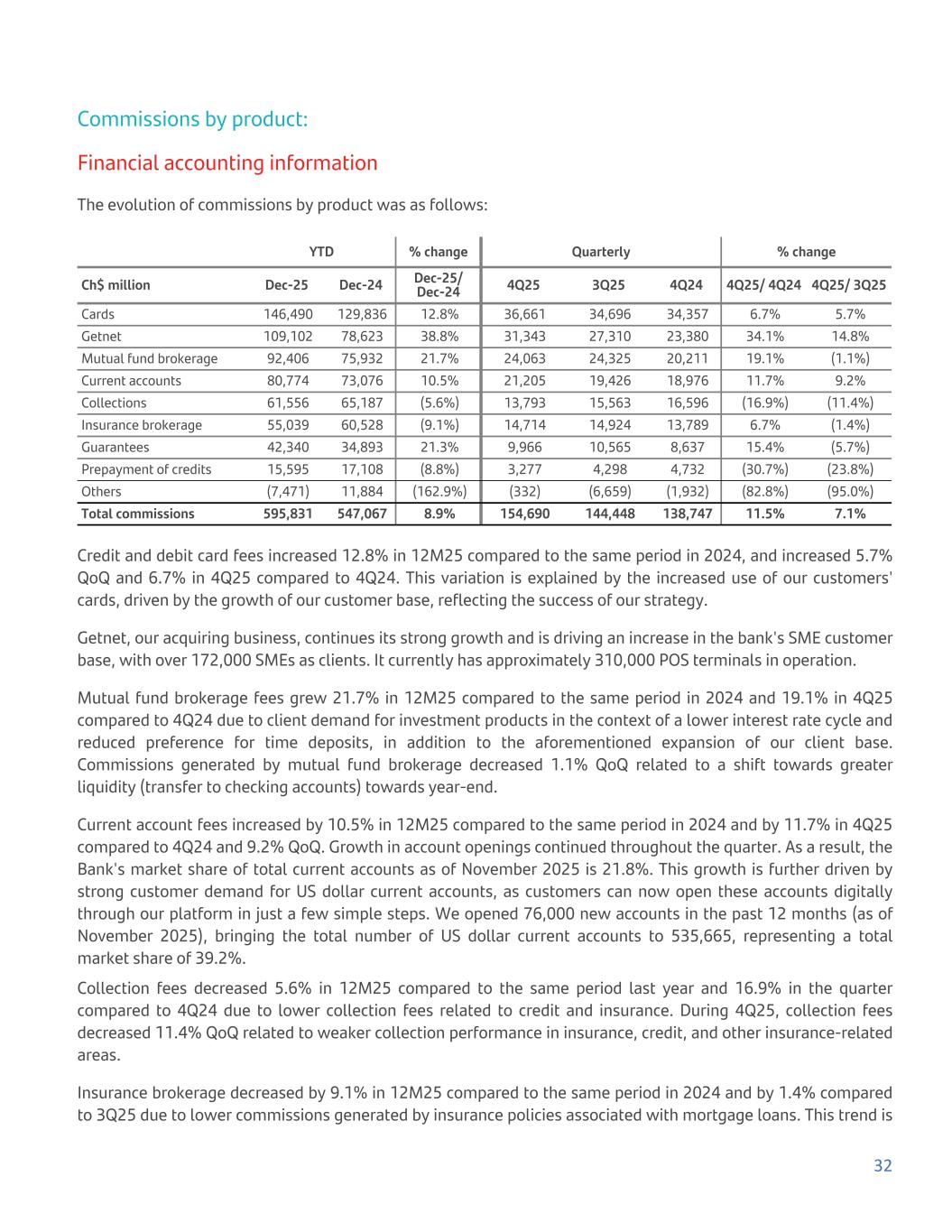 Commissions by product: Financial accounting information The evolution of commissions by product was as follows: YTD % change Quarterly % change Ch$ million Dec-25 Dec-24 Dec-25/ Dec-24 4Q25 3Q25 4Q24 4Q25/ 4Q24 4Q25/ 3Q25 Cards 146,490 129,836 12.8% 36,661 34,696 34,357 6.7% 5.7% Getnet 109,102 78,623 38.8% 31,343 27,310 23,380 34.1% 14.8% Mutual fund brokerage 92,406 75,932 21.7% 24,063 24,325 20,211 19.1% (1.1%) Current accounts 80,774 73,076 10.5% 21,205 19,426 18,976 11.7% 9.2% Collections 61,556 65,187 (5.6%) 13,793 15,563 16,596 (16.9%) (11.4%) Insurance brokerage 55,039 60,528 (9.1%) 14,714 14,924 13,789 6.7% (1.4%) Guarantees 42,340 34,893 21.3% 9,966 10,565 8,637 15.4% (5.7%) Prepayment of credits 15,595 17,108 (8.8%) 3,277 4,298 4,732 (30.7%) (23.8%) Others (7,471) 11,884 (162.9%) (332) (6,659) (1,932) (82.8%) (95.0%) Total commissions 595,831 547,067 8.9% 154,690 144,448 138,747 11.5% 7.1% Credit and debit card fees increased 12.8% in 12M25 compared to the same period in 2024, and increased 5.7% QoQ and 6.7% in 4Q25 compared to 4Q24. This variation is explained by the increased use of our customers' cards, driven by the growth of our customer base, reflecting the success of our strategy. Getnet, our acquiring business, continues its strong growth and is driving an increase in the bank's SME customer base, with over 172,000 SMEs as clients. It currently has approximately 310,000 POS terminals in operation. Mutual fund brokerage fees grew 21.7% in 12M25 compared to the same period in 2024 and 19.1% in 4Q25 compared to 4Q24 due to client demand for investment products in the context of a lower interest rate cycle and reduced preference for time deposits, in addition to the aforementioned expansion of our client base. Commissions generated by mutual fund brokerage decreased 1.1% QoQ related to a shift towards greater liquidity (transfer to checking accounts) towards year-end. Current account fees increased by 10.5% in 12M25 compared to the same period in 2024 and by 11.7% in 4Q25 compared to 4Q24 and 9.2% QoQ. Growth in account openings continued throughout the quarter. As a result, the Bank's market share of total current accounts as of November 2025 is 21.8%. This growth is further driven by strong customer demand for US dollar current accounts, as customers can now open these accounts digitally through our platform in just a few simple steps. We opened 76,000 new accounts in the past 12 months (as of November 2025), bringing the total number of US dollar current accounts to 535,665, representing a total market share of 39.2%. Collection fees decreased 5.6% in 12M25 compared to the same period last year and 16.9% in the quarter compared to 4Q24 due to lower collection fees related to credit and insurance. During 4Q25, collection fees decreased 11.4% QoQ related to weaker collection performance in insurance, credit, and other insurance-related areas. Insurance brokerage decreased by 9.1% in 12M25 compared to the same period in 2024 and by 1.4% compared to 3Q25 due to lower commissions generated by insurance policies associated with mortgage loans. This trend is 32