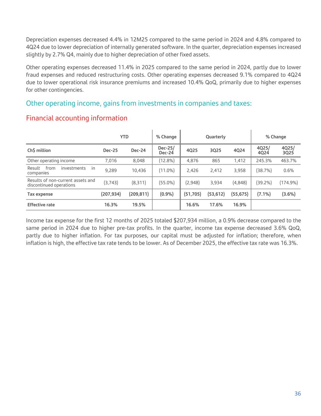Depreciation expenses decreased 4.4% in 12M25 compared to the same period in 2024 and 4.8% compared to 4Q24 due to lower depreciation of internally generated software. In the quarter, depreciation expenses increased slightly by 2.7% Q4, mainly due to higher depreciation of other fixed assets. Other operating expenses decreased 11.4% in 2025 compared to the same period in 2024, partly due to lower fraud expenses and reduced restructuring costs. Other operating expenses decreased 9.1% compared to 4Q24 due to lower operational risk insurance premiums and increased 10.4% QoQ, primarily due to higher expenses for other contingencies. Other operating income, gains from investments in companies and taxes: Financial accounting information YTD % Change Quarterly % Change Ch$ million Dec-25 Dec-24 Dec-25/ Dec-24 4Q25 3Q25 4Q24 4Q25/ 4Q24 4Q25/ 3Q25 Other operating income 7,016 8,048 (12.8%) 4,876 865 1,412 245.3% 463.7% Result from investments in companies 9,289 10,436 (11.0%) 2,426 2,412 3,958 (38.7%) 0.6% Results of non-current assets and discontinued operations (3,743) (8,311) (55.0%) (2,948) 3,934 (4,848) (39.2%) (174.9%) Tax expense (207,934) (209,811) (0.9%) (51,705) (53,612) (55,675) (7.1%) (3.6%) Effective rate 16.3% 19.5%   16.6% 17.6% 16.9% Income tax expense for the first 12 months of 2025 totaled $207,934 million, a 0.9% decrease compared to the same period in 2024 due to higher pre-tax profits. In the quarter, income tax expense decreased 3.6% QoQ, partly due to higher inflation. For tax purposes, our capital must be adjusted for inflation; therefore, when inflation is high, the effective tax rate tends to be lower. As of December 2025, the effective tax rate was 16.3%. 36