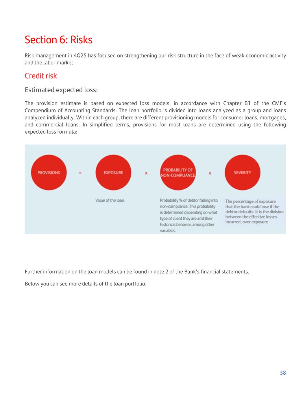 Section 6: Risks Risk management in 4Q25 has focused on strengthening our risk structure in the face of weak economic activity and the labor market. Credit risk Estimated expected loss: The provision estimate is based on expected loss models, in accordance with Chapter B1 of the CMF's Compendium of Accounting Standards. The loan portfolio is divided into loans analyzed as a group and loans analyzed individually. Within each group, there are different provisioning models for consumer loans, mortgages, and commercial loans. In simplified terms, provisions for most loans are determined using the following expected loss formula: Further information on the loan models can be found in note 2 of the Bank's financial statements. Below you can see more details of the loan portfolio. 38