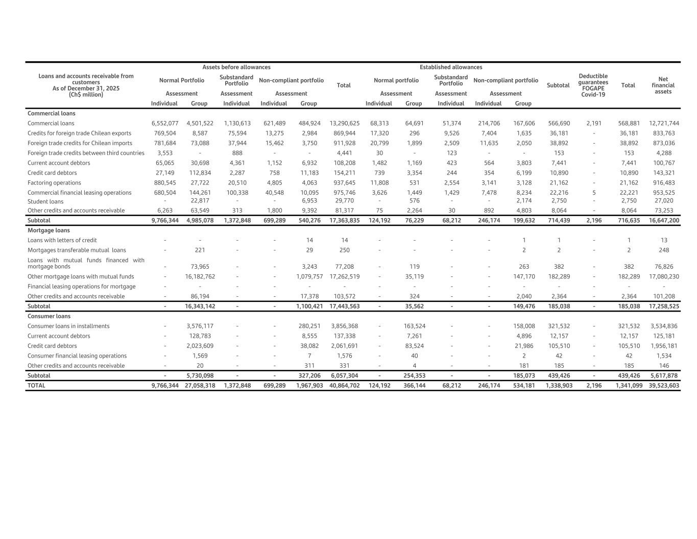 Loans and accounts receivable from customers As of December 31, 2025 (Ch$ million) Assets before allowances Total Established allowances Subtotal Deductible guarantees FOGAPE Covid-19 Total Net financial assets Normal Portfolio Substandard Portfolio Non-compliant portfolio Normal portfolio Substandard Portfolio Non-compliant portfolio Assessment Assessment Assessment Assessment Assessment Assessment Individual Group Individual Individual Group Individual Group Individual Individual Group Commercial loans Commercial loans 6,552,077 4,501,522 1,130,613 621,489 484,924 13,290,625 68,313 64,691 51,374 214,706 167,606 566,690 2,191 568,881 12,721,744 Credits for foreign trade Chilean exports 769,504 8,587 75,594 13,275 2,984 869,944 17,320 296 9,526 7,404 1,635 36,181 - 36,181 833,763 Foreign trade credits for Chilean imports 781,684 73,088 37,944 15,462 3,750 911,928 20,799 1,899 2,509 11,635 2,050 38,892 - 38,892 873,036 Foreign trade credits between third countries 3,553 - 888 - - 4,441 30 - 123 - - 153 - 153 4,288 Current account debtors 65,065 30,698 4,361 1,152 6,932 108,208 1,482 1,169 423 564 3,803 7,441 - 7,441 100,767 Credit card debtors 27,149 112,834 2,287 758 11,183 154,211 739 3,354 244 354 6,199 10,890 - 10,890 143,321 Factoring operations 880,545 27,722 20,510 4,805 4,063 937,645 11,808 531 2,554 3,141 3,128 21,162 - 21,162 916,483 Commercial financial leasing operations 680,504 144,261 100,338 40,548 10,095 975,746 3,626 1,449 1,429 7,478 8,234 22,216 5 22,221 953,525 Student loans - 22,817 - - 6,953 29,770 - 576 - - 2,174 2,750 - 2,750 27,020 Other credits and accounts receivable 6,263 63,549 313 1,800 9,392 81,317 75 2,264 30 892 4,803 8,064 - 8,064 73,253 Subtotal 9,766,344 4,985,078 1,372,848 699,289 540,276 17,363,835 124,192 76,229 68,212 246,174 199,632 714,439 2,196 716,635 16,647,200 Mortgage loans Loans with letters of credit - - - - 14 14 - - - - 1 1 - 1 13 Mortgages transferable mutual loans - 221 - - 29 250 - - - - 2 2 - 2 248 Loans with mutual funds financed with mortgage bonds - 73,965 - - 3,243 77,208 - 119 - - 263 382 - 382 76,826 Other mortgage loans with mutual funds - 16,182,762 - - 1,079,757 17,262,519 - 35,119 - - 147,170 182,289 - 182,289 17,080,230 Financial leasing operations for mortgage - - - - - - - - - - - - - - - Other credits and accounts receivable - 86,194 - - 17,378 103,572 - 324 - - 2,040 2,364 - 2,364 101,208 Subtotal - 16,343,142 - - 1,100,421 17,443,563 - 35,562 - - 149,476 185,038 - 185,038 17,258,525 Consumer loans Consumer loans in installments - 3,576,117 - - 280,251 3,856,368 - 163,524 - - 158,008 321,532 - 321,532 3,534,836 Current account debtors - 128,783 - - 8,555 137,338 - 7,261 - - 4,896 12,157 - 12,157 125,181 Credit card debtors - 2,023,609 - - 38,082 2,061,691 - 83,524 - - 21,986 105,510 - 105,510 1,956,181 Consumer financial leasing operations - 1,569 - - 7 1,576 - 40 - - 2 42 - 42 1,534 Other credits and accounts receivable - 20 - - 311 331 - 4 - - 181 185 - 185 146 Subtotal - 5,730,098 - - 327,206 6,057,304 - 254,353 - - 185,073 439,426 - 439,426 5,617,878 TOTAL 9,766,344 27,058,318 1,372,848 699,289 1,967,903 40,864,702 124,192 366,144 68,212 246,174 534,181 1,338,903 2,196 1,341,099 39,523,603