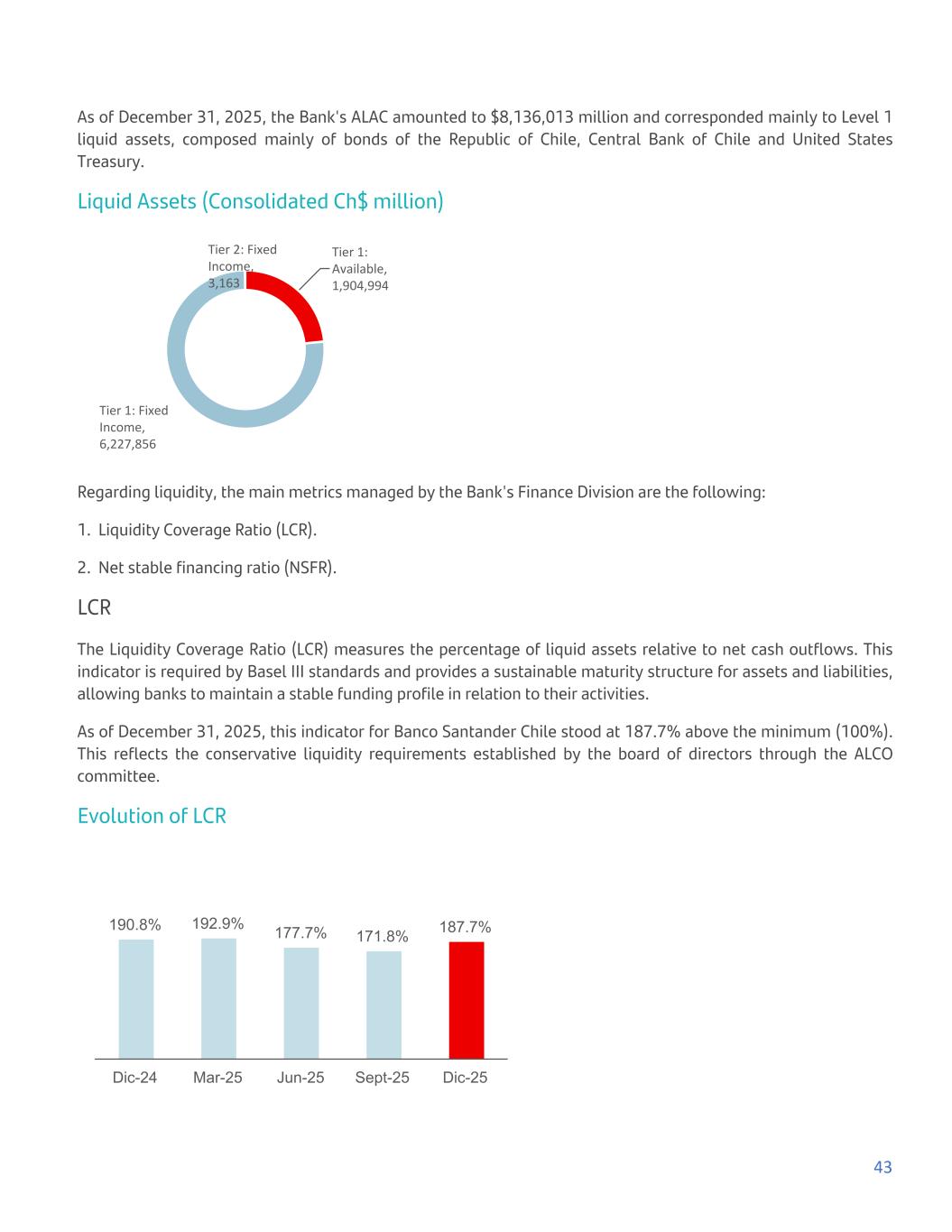 As of December 31, 2025, the Bank's ALAC amounted to $8,136,013 million and corresponded mainly to Level 1 liquid assets, composed mainly of bonds of the Republic of Chile, Central Bank of Chile and United States Treasury. Liquid Assets (Consolidated Ch$ million) Tier 1: Available, 1,904,994 Tier 1: Fixed Income, 6,227,856 Tier 2: Fixed Income, 3,163 Regarding liquidity, the main metrics managed by the Bank's Finance Division are the following: 1. Liquidity Coverage Ratio (LCR). 2. Net stable financing ratio (NSFR). LCR The Liquidity Coverage Ratio (LCR) measures the percentage of liquid assets relative to net cash outflows. This indicator is required by Basel III standards and provides a sustainable maturity structure for assets and liabilities, allowing banks to maintain a stable funding profile in relation to their activities. As of December 31, 2025, this indicator for Banco Santander Chile stood at 187.7% above the minimum (100%). This reflects the conservative liquidity requirements established by the board of directors through the ALCO committee. Evolution of LCR 190.8% 192.9% 177.7% 171.8% 187.7% Dic-24 Mar-25 Jun-25 Sept-25 Dic-25 43