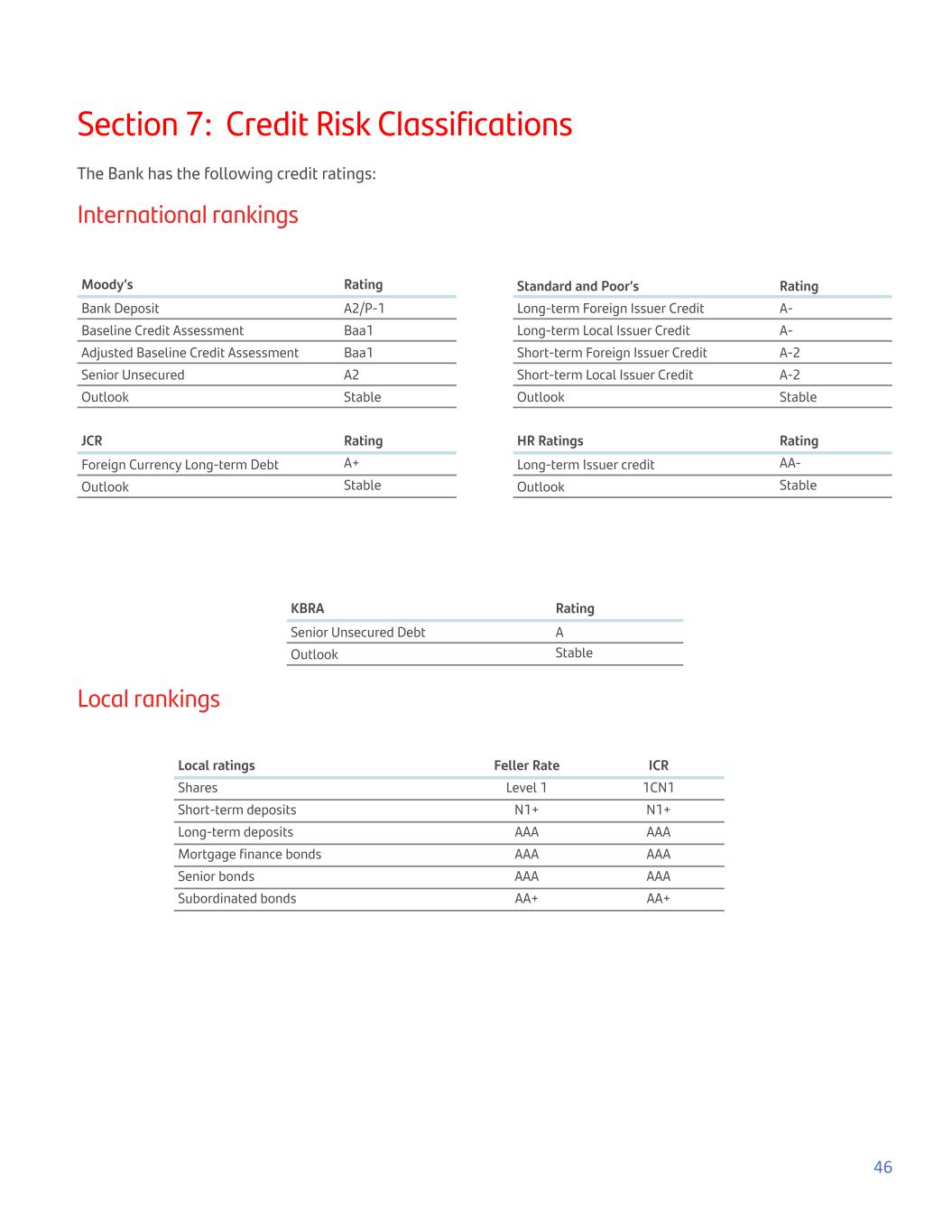 Section 7: Credit Risk Classifications The Bank has the following credit ratings: International rankings Moody’s Rating Bank Deposit A2/P-1 Baseline Credit Assessment Baa1 Adjusted Baseline Credit Assessment Baa1 Senior Unsecured A2 Outlook Stable Standard and Poor’s Rating Long-term Foreign Issuer Credit A- Long-term Local Issuer Credit A- Short-term Foreign Issuer Credit A-2 Short-term Local Issuer Credit A-2 Outlook Stable JCR Rating Foreign Currency Long-term Debt A+ Outlook Stable HR Ratings Rating Long-term Issuer credit AA- Outlook Stable KBRA Rating Senior Unsecured Debt A Outlook Stable Local rankings Local ratings Feller Rate ICR Shares Level 1 1CN1 Short-term deposits N1+ N1+ Long-term deposits AAA AAA Mortgage finance bonds AAA AAA Senior bonds AAA AAA Subordinated bonds AA+ AA+ 46