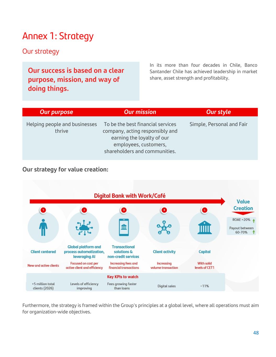 Annex 1: Strategy Our strategy In its more than four decades in Chile, Banco Santander Chile has achieved leadership in market share, asset strength and profitability. Our success is based on a clear purpose, mission, and way of doing things. Our purpose Our mission Our style Helping people and businesses thrive To be the best financial services company, acting responsibly and earning the loyalty of our employees, customers, shareholders and communities. Simple, Personal and Fair Our strategy for value creation: Furthermore, the strategy is framed within the Group's principles at a global level, where all operations must aim for organization-wide objectives. 48