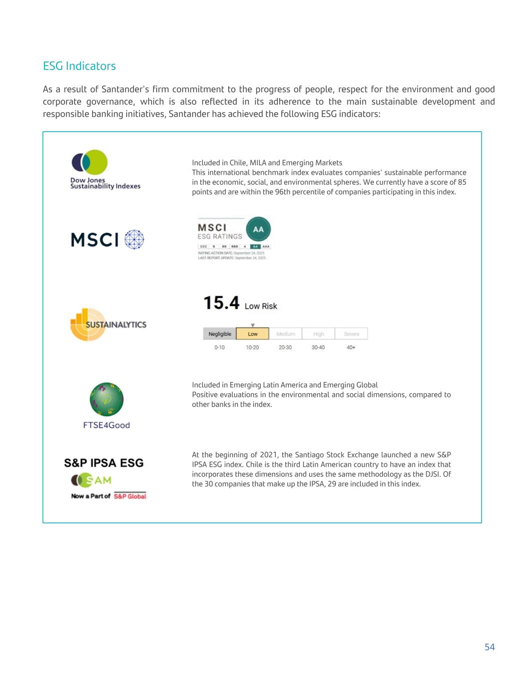 ESG Indicators As a result of Santander's firm commitment to the progress of people, respect for the environment and good corporate governance, which is also reflected in its adherence to the main sustainable development and responsible banking initiatives, Santander has achieved the following ESG indicators: Included in Chile, MILA and Emerging Markets This international benchmark index evaluates companies' sustainable performance in the economic, social, and environmental spheres. We currently have a score of 85 points and are within the 96th percentile of companies participating in this index. Included in Emerging Latin America and Emerging Global Positive evaluations in the environmental and social dimensions, compared to other banks in the index. At the beginning of 2021, the Santiago Stock Exchange launched a new S&P IPSA ESG index. Chile is the third Latin American country to have an index that incorporates these dimensions and uses the same methodology as the DJSI. Of the 30 companies that make up the IPSA, 29 are included in this index. 54