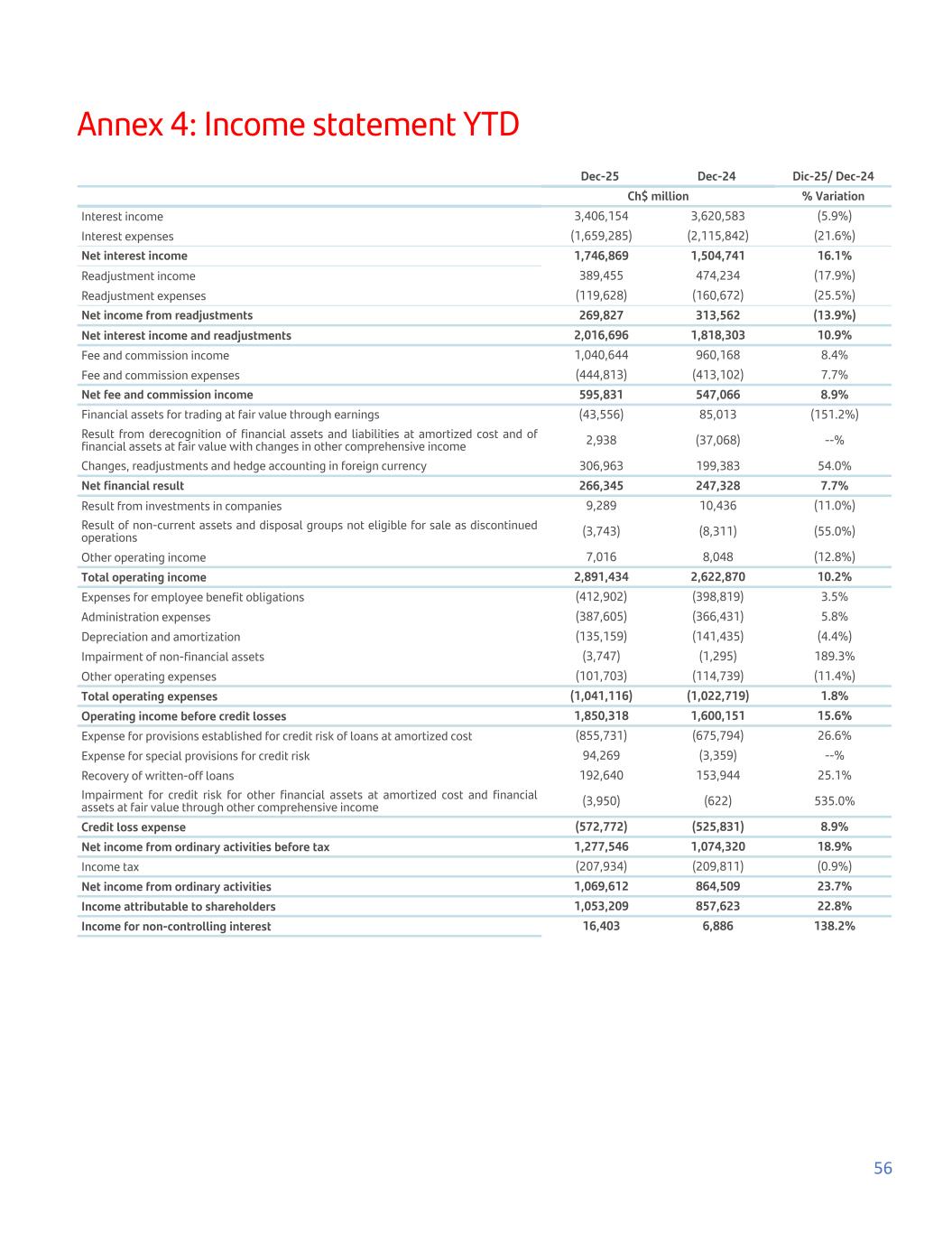 Annex 4: Income statement YTD Dec-25 Dec-24 Dic-25/ Dec-24 Ch$ million % Variation Interest income 3,406,154 3,620,583 (5.9%) Interest expenses (1,659,285) (2,115,842) (21.6%) Net interest income 1,746,869 1,504,741 16.1% Readjustment income 389,455 474,234 (17.9%) Readjustment expenses (119,628) (160,672) (25.5%) Net income from readjustments 269,827 313,562 (13.9%) Net interest income and readjustments 2,016,696 1,818,303 10.9% Fee and commission income 1,040,644 960,168 8.4% Fee and commission expenses (444,813) (413,102) 7.7% Net fee and commission income 595,831 547,066 8.9% Financial assets for trading at fair value through earnings (43,556) 85,013 (151.2%) Result from derecognition of financial assets and liabilities at amortized cost and of financial assets at fair value with changes in other comprehensive income 2,938 (37,068) --% Changes, readjustments and hedge accounting in foreign currency 306,963 199,383 54.0% Net financial result 266,345 247,328 7.7% Result from investments in companies 9,289 10,436 (11.0%) Result of non-current assets and disposal groups not eligible for sale as discontinued operations (3,743) (8,311) (55.0%) Other operating income 7,016 8,048 (12.8%) Total operating income 2,891,434 2,622,870 10.2% Expenses for employee benefit obligations (412,902) (398,819) 3.5% Administration expenses (387,605) (366,431) 5.8% Depreciation and amortization (135,159) (141,435) (4.4%) Impairment of non-financial assets (3,747) (1,295) 189.3% Other operating expenses (101,703) (114,739) (11.4%) Total operating expenses (1,041,116) (1,022,719) 1.8% Operating income before credit losses 1,850,318 1,600,151 15.6% Expense for provisions established for credit risk of loans at amortized cost (855,731) (675,794) 26.6% Expense for special provisions for credit risk 94,269 (3,359) --% Recovery of written-off loans 192,640 153,944 25.1% Impairment for credit risk for other financial assets at amortized cost and financial assets at fair value through other comprehensive income (3,950) (622) 535.0% Credit loss expense (572,772) (525,831) 8.9% Net income from ordinary activities before tax 1,277,546 1,074,320 18.9% Income tax (207,934) (209,811) (0.9%) Net income from ordinary activities 1,069,612 864,509 23.7% Income attributable to shareholders 1,053,209 857,623 22.8% Income for non-controlling interest 16,403 6,886 138.2% 56