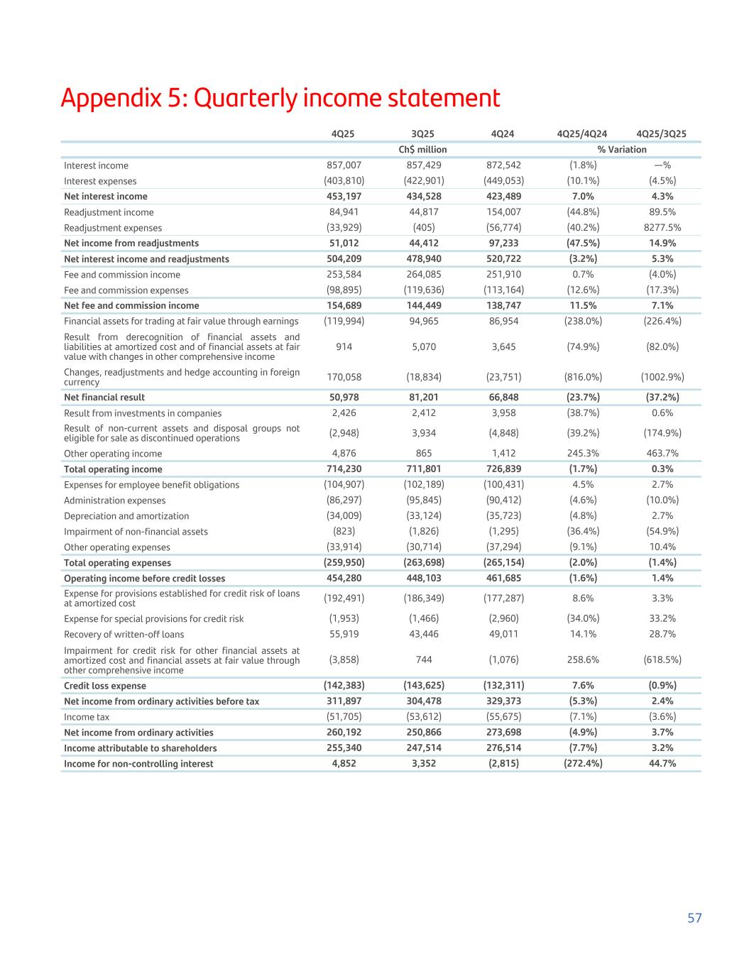 Appendix 5: Quarterly income statement 4Q25 3Q25 4Q24 4Q25/4Q24 4Q25/3Q25   Ch$ million % Variation Interest income 857,007 857,429 872,542 (1.8%) —% Interest expenses (403,810) (422,901) (449,053) (10.1%) (4.5%) Net interest income 453,197 434,528 423,489 7.0% 4.3% Readjustment income 84,941 44,817 154,007 (44.8%) 89.5% Readjustment expenses (33,929) (405) (56,774) (40.2%) 8277.5% Net income from readjustments 51,012 44,412 97,233 (47.5%) 14.9% Net interest income and readjustments 504,209 478,940 520,722 (3.2%) 5.3% Fee and commission income 253,584 264,085 251,910 0.7% (4.0%) Fee and commission expenses (98,895) (119,636) (113,164) (12.6%) (17.3%) Net fee and commission income 154,689 144,449 138,747 11.5% 7.1% Financial assets for trading at fair value through earnings (119,994) 94,965 86,954 (238.0%) (226.4%) Result from derecognition of financial assets and liabilities at amortized cost and of financial assets at fair value with changes in other comprehensive income 914 5,070 3,645 (74.9%) (82.0%) Changes, readjustments and hedge accounting in foreign currency 170,058 (18,834) (23,751) (816.0%) (1002.9%) Net financial result 50,978 81,201 66,848 (23.7%) (37.2%) Result from investments in companies 2,426 2,412 3,958 (38.7%) 0.6% Result of non-current assets and disposal groups not eligible for sale as discontinued operations (2,948) 3,934 (4,848) (39.2%) (174.9%) Other operating income 4,876 865 1,412 245.3% 463.7% Total operating income 714,230 711,801 726,839 (1.7%) 0.3% Expenses for employee benefit obligations (104,907) (102,189) (100,431) 4.5% 2.7% Administration expenses (86,297) (95,845) (90,412) (4.6%) (10.0%) Depreciation and amortization (34,009) (33,124) (35,723) (4.8%) 2.7% Impairment of non-financial assets (823) (1,826) (1,295) (36.4%) (54.9%) Other operating expenses (33,914) (30,714) (37,294) (9.1%) 10.4% Total operating expenses (259,950) (263,698) (265,154) (2.0%) (1.4%) Operating income before credit losses 454,280 448,103 461,685 (1.6%) 1.4% Expense for provisions established for credit risk of loans at amortized cost (192,491) (186,349) (177,287) 8.6% 3.3% Expense for special provisions for credit risk (1,953) (1,466) (2,960) (34.0%) 33.2% Recovery of written-off loans 55,919 43,446 49,011 14.1% 28.7% Impairment for credit risk for other financial assets at amortized cost and financial assets at fair value through other comprehensive income (3,858) 744 (1,076) 258.6% (618.5%) Credit loss expense (142,383) (143,625) (132,311) 7.6% (0.9%) Net income from ordinary activities before tax 311,897 304,478 329,373 (5.3%) 2.4% Income tax (51,705) (53,612) (55,675) (7.1%) (3.6%) Net income from ordinary activities 260,192 250,866 273,698 (4.9%) 3.7% Income attributable to shareholders 255,340 247,514 276,514 (7.7%) 3.2% Income for non-controlling interest 4,852 3,352 (2,815) (272.4%) 44.7% 57
