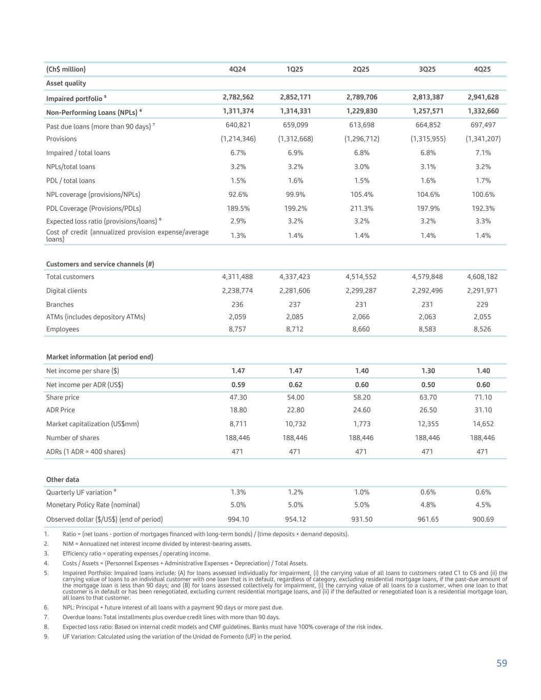 (Ch$ million) 4Q24 1Q25 2Q25 3Q25 4Q25 Asset quality Impaired portfolio ⁵ 2,782,562 2,852,171 2,789,706 2,813,387 2,941,628 Non-Performing Loans (NPLs) ⁶ 1,311,374 1,314,331 1,229,830 1,257,571 1,332,660 Past due loans (more than 90 days) ⁷ 640,821 659,099 613,698 664,852 697,497 Provisions (1,214,346) (1,312,668) (1,296,712) (1,315,955) (1,341,207) Impaired / total loans 6.7% 6.9% 6.8% 6.8% 7.1% NPLs/total loans 3.2% 3.2% 3.0% 3.1% 3.2% PDL / total loans 1.5% 1.6% 1.5% 1.6% 1.7% NPL coverage (provisions/NPLs) 92.6% 99.9% 105.4% 104.6% 100.6% PDL Coverage (Provisions/PDLs) 189.5% 199.2% 211.3% 197.9% 192.3% Expected loss ratio (provisions/loans) ⁸ 2.9% 3.2% 3.2% 3.2% 3.3% Cost of credit (annualized provision expense/average loans) 1.3% 1.4% 1.4% 1.4% 1.4% Customers and service channels (#) Total customers 4,311,488 4,337,423 4,514,552 4,579,848 4,608,182 Digital clients 2,238,774 2,281,606 2,299,287 2,292,496 2,291,971 Branches 236 237 231 231 229 ATMs (includes depository ATMs) 2,059 2,085 2,066 2,063 2,055 Employees 8,757 8,712 8,660 8,583 8,526 Market information (at period end) Net income per share ($) 1.47 1.47 1.40 1.30 1.40 Net income per ADR (US$) 0.59 0.62 0.60 0.50 0.60 Share price 47.30 54.00 58.20 63.70 71.10 ADR Price 18.80 22.80 24.60 26.50 31.10 Market capitalization (US$mm) 8,711 10,732 1,773 12,355 14,652 Number of shares 188,446 188,446 188,446 188,446 188,446 ADRs (1 ADR = 400 shares) 471 471 471 471 471 Other data Quarterly UF variation ⁹ 1.3% 1.2% 1.0% 0.6% 0.6% Monetary Policy Rate (nominal) 5.0% 5.0% 5.0% 4.8% 4.5% Observed dollar ($/US$) (end of period) 994.10 954.12 931.50 961.65 900.69 1. Ratio = (net loans - portion of mortgages financed with long-term bonds) / (time deposits + demand deposits). 2. NIM = Annualized net interest income divided by interest-bearing assets. 3. Efficiency ratio = operating expenses / operating income. 4. Costs / Assets = (Personnel Expenses + Administrative Expenses + Depreciation) / Total Assets. 5. Impaired Portfolio: Impaired loans include: (A) for loans assessed individually for impairment, (i) the carrying value of all loans to customers rated C1 to C6 and (ii) the carrying value of loans to an individual customer with one loan that is in default, regardless of category, excluding residential mortgage loans, if the past-due amount of the mortgage loan is less than 90 days; and (B) for loans assessed collectively for impairment, (i) the carrying value of all loans to a customer, when one loan to that customer is in default or has been renegotiated, excluding current residential mortgage loans, and (ii) if the defaulted or renegotiated loan is a residential mortgage loan, all loans to that customer. 6. NPL: Principal + future interest of all loans with a payment 90 days or more past due. 7. Overdue loans: Total installments plus overdue credit lines with more than 90 days. 8. Expected loss ratio: Based on internal credit models and CMF guidelines. Banks must have 100% coverage of the risk index. 9. UF Variation: Calculated using the variation of the Unidad de Fomento (UF) in the period. 59
