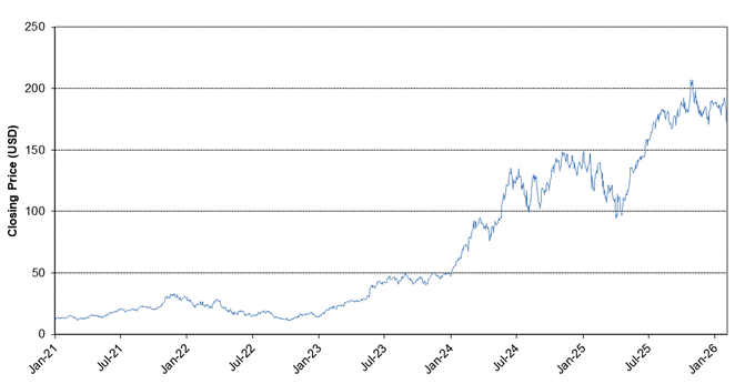 The graph below sets forth the historical performance of the NVDA Underlier based on the daily Closing Values from January 4, 2021 through February 5, 2026. We obtained the Closing Values shown in the graph below from Bloomberg. We have not independently verified the accuracy or completeness of the information obtained from Bloomberg. The Closing Values below may reflect adjustments in response to certain corporate actions, such as stock splits, public offerings, mergers and acquisitions, spin-offs, extraordinary dividends, delistings and bankruptcy.