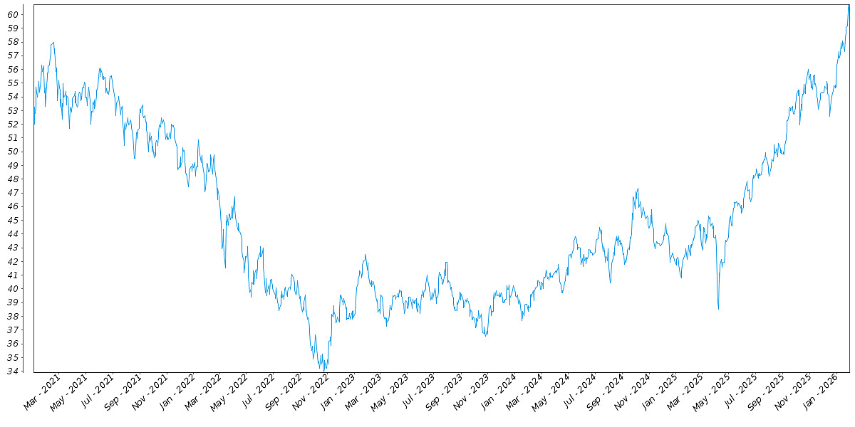 The following graph sets forth the daily historical performance of the EEM in the period from January 2, 2021 through the pricing date. We obtained this historical data from Bloomberg L.P. We have not independently verified the accuracy or completeness of the information obtained from Bloomberg L.P. On the pricing date, the Closing Market Price of the EEM was $59.10.