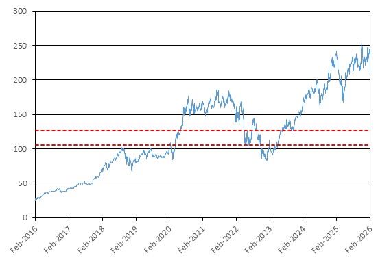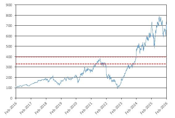 The graph below illustrates the performance of META from February 6, 2016 through February 6, 2026. The dotted lines represent its Contingent Interest Barrier Value of $396.876, which is equal to