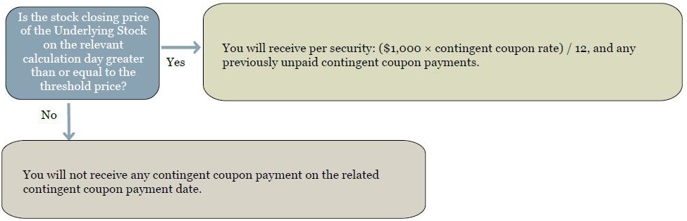 On each contingent coupon payment date, you will receive a contingent coupon payment at a per annum rate equal to the contingent coupon rate if, and only if, the stock closing price of the Underlying Stock on the related calculation day is greater than or equal to the threshold price. In addition, if the stock closing price of the Underlying Stock on one or more calculation days is less than the threshold price and, on a subsequent calculation day, the stock closing price of the Underlying Stock is greater than or equal to the threshold price, on the contingent coupon payment date related to that subsequent calculation day, you will receive the contingent coupon payment due for that subsequent calculation day plus all previously unpaid contingent coupon payments (without interest on amounts previously unpaid). Each “contingent coupon payment,” if any, will be calculated per security as follows: ($1,000 × contingent coupon rate) / 12 Notwithstanding anything to the contrary in the accompanying product supplement, any contingent coupon payment will be rounded to the nearest cent, with one-half cent rounded upward. If the stock closing price of the Underlying Stock on any calculation day is less than the threshold price, you will not receive any contingent coupon payment on the related contingent coupon payment date. If the stock closing price of the Underlying Stock on a calculation day is less than the threshold price and the stock closing price of the Underlying Stock on each subsequent calculation day up to and including the final calculation day is less than the threshold price, you will not receive any unpaid contingent coupon payment in respect of any of those calculation days. In addition, if the stock closing price of the Underlying Stock is less than the threshold price on all calculation days, you will not receive any contingent coupon payments over the term of the securities. |