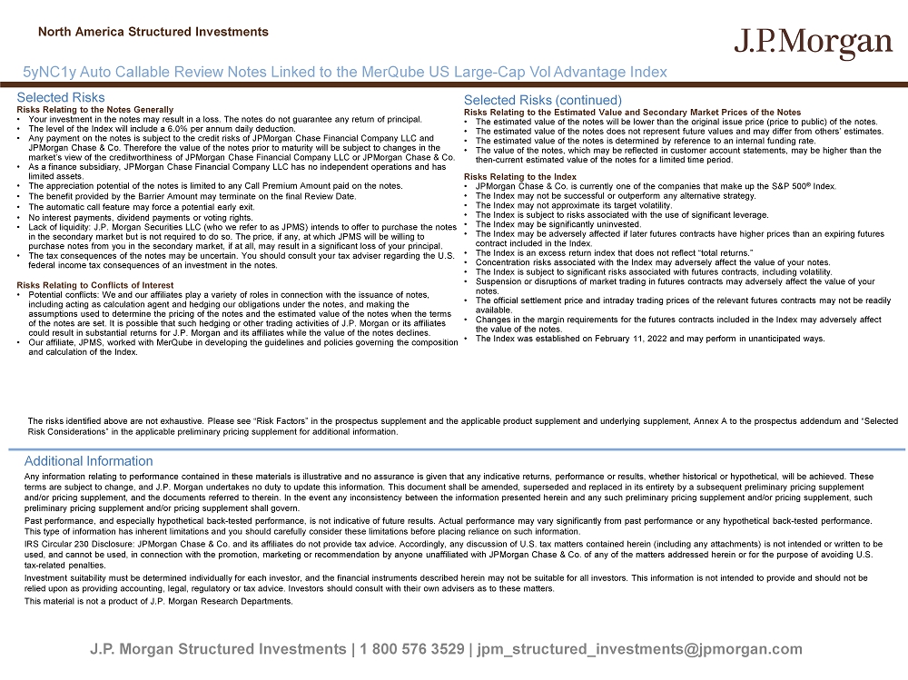 J.P. Morgan Structured Investments | 1 800 576 3529 | jpm_structured_investments@jpmorgan.com Selected Risks Risks Relating to the Notes Generally • Your investment in the notes may result in a loss. The notes do not guarantee any return of principal. • The level of the Index will include a 6.0% per annum daily deduction. • Any payment on the notes is subject to the credit risks of JPMorgan Chase Financial Company LLC and JPMorgan Chase & Co. Therefore the value of the notes prior to maturity will be subject to changes in the market’s view of the creditworthiness of JPMorgan Chase Financial Company LLC or JPMorgan Chase & Co. • As a finance subsidiary, JPMorgan Chase Financial Company LLC has no independent operations and has limited assets. • The appreciation potential of the notes is limited to any Call Premium Amount paid on the notes. • The benefit provided by the Barrier Amount may terminate on the final Review Date. • The automatic call feature may force a potential early exit. • No interest payments, dividend payments or voting rights. • Lack of liquidity: J.P. Morgan Securities LLC (who we refer to as JPMS) intends to offer to purchase the notes in the secondary market but is not required to do so. The price, if any, at which JPMS will be willing to purchase notes from you in the secondary market, if at all, may result in a significant loss of your principal. • The tax consequences of the notes may be uncertain. You should consult your tax adviser regarding the U.S. federal income tax consequences of an investment in the notes. Risks Relating to Conflicts of Interest • Potential conflicts: We and our affiliates play a variety of roles in connection with the issuance of notes, including acting as calculation agent and hedging our obligations under the notes, and making the assumptions used to determine the pricing of the notes and the estimated value of the notes when the terms of the notes are set. It is possible that such hedging or other trading activities of J.P. Morgan or its affiliates could result in substantial returns for J.P. Morgan and its affiliates while the value of the notes declines. • Our affiliate, JPMS, worked with MerQube in developing the guidelines and policies governing the composition and calculation of the Index. Selected Risks (continued) Risks Relating to the Estimated Value and Secondary Market Prices of the Notes • The estimated value of the notes will be lower than the original issue price (price to public) of the notes. • The estimated value of the notes does not represent future values and may differ from others’ estimates. • The estimated value of the notes is determined by reference to an internal funding rate. • The value of the notes, which may be reflected in customer account statements, may be higher than the then - current estimated value of the notes for a limited time period. Risks Relating to the Index • JPMorgan Chase & Co. is currently one of the companies that make up the S&P 500 ® Index. • The Index may not be successful or outperform any alternative strategy. • The Index may not approximate its target volatility. • The Index is subject to risks associated with the use of significant leverage. • The Index may be significantly uninvested. • The Index may be adversely affected if later futures contracts have higher prices than an expiring futures contract included in the Index. • The Index is an excess return index that does not reflect “total returns.” • Concentration risks associated with the Index may adversely affect the value of your notes. • The Index is subject to significant risks associated with futures contracts, including volatility. • Suspension or disruptions of market trading in futures contracts may adversely affect the value of your notes. • The official settlement price and intraday trading prices of the relevant futures contracts may not be readily available. • Changes in the margin requirements for the futures contracts included in the Index may adversely affect the value of the notes. • The Index was established on February 11, 2022 and may perform in unanticipated ways. Additional Information Any information relating to performance contained in these materials is illustrative and no assurance is given that any indic ati ve returns, performance or results, whether historical or hypothetical, will be achieved. These terms are subject to change, and J.P. Morgan undertakes no duty to update this information. This document shall be amended, s upe rseded and replaced in its entirety by a subsequent preliminary pricing supplement and/or pricing supplement, and the documents referred to therein. In the event any inconsistency between the information pres ent ed herein and any such preliminary pricing supplement and/or pricing supplement, such preliminary pricing supplement and/or pricing supplement shall govern. Past performance, and especially hypothetical back - tested performance, is not indicative of future results. Actual performance m ay vary significantly from past performance or any hypothetical back - tested performance. This type of information has inherent limitations and you should carefully consider these limitations before placing reliance on such information. IRS Circular 230 Disclosure: JPMorgan Chase & Co. and its affiliates do not provide tax advice. Accordingly, any discussion o f U .S. tax matters contained herein (including any attachments) is not intended or written to be used, and cannot be used, in connection with the promotion, marketing or recommendation by anyone unaffiliated with JPMorgan Cha se & Co. of any of the matters addressed herein or for the purpose of avoiding U.S. tax - related penalties. Investment suitability must be determined individually for each investor, and the financial instruments described herein may not be suitable for all investors. This information is not intended to provide and should not be relied upon as