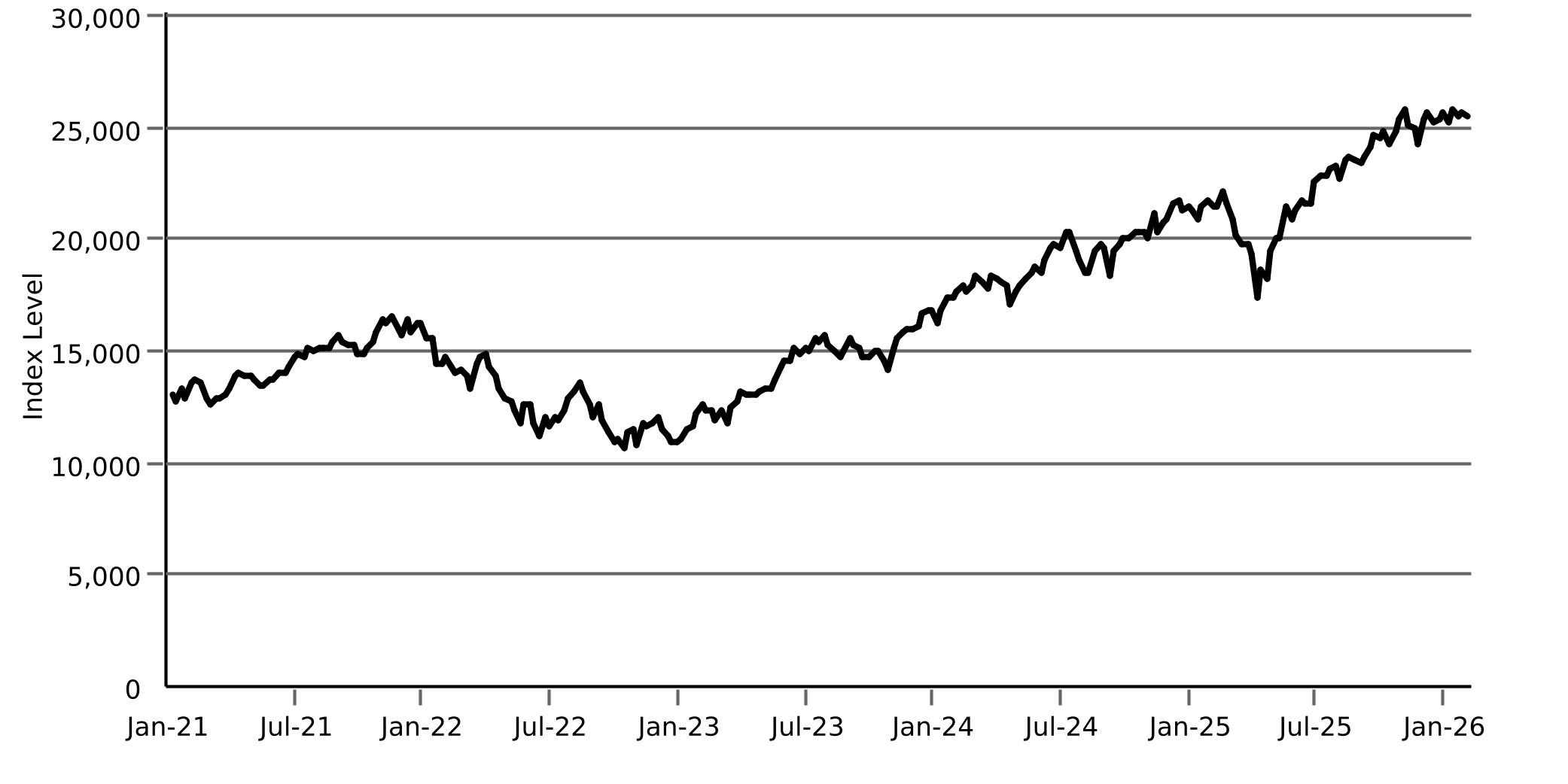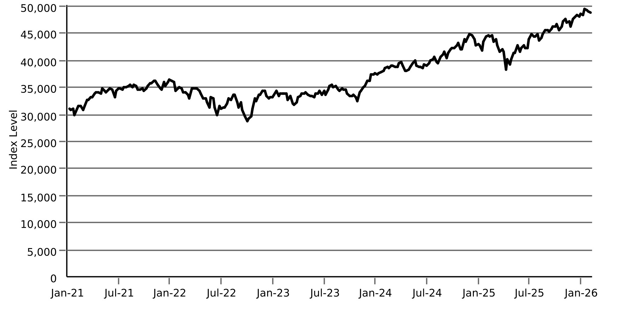 The following graphs set forth the historical performance of each Index based on the weekly historical closing levels from January 8, 2021 through January 30, 2026. The closing level of the Dow Jones Industrial Average® on February 5, 2026 was 48,908.72. The closing level of the Nasdaq-100 Index® on February 5, 2026 was 24,548.69. The closing level of the Russell 2000® Index on February 5, 2026 was 2,577.646. We obtained the closing levels above and below from the Bloomberg Professional® service (“Bloomberg”), without independent verification.