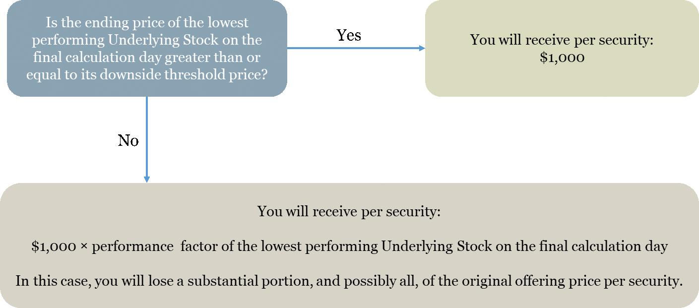 If the securities are not automatically called prior to the stated maturity date, you will be entitled to receive on the stated maturity date a cash payment per security in U.S. dollars equal to the maturity payment amount (in addition to the final contingent coupon payment, and any previously unpaid contingent coupon payments, if due). The “maturity payment amount” per security will equal: • if the ending price of the lowest performing Underlying Stock on the final calculation day is greater than or equal to its downside threshold price: $1,000; or • if the ending price of the lowest performing Underlying Stock on the final calculation day is less than its downside threshold price: |