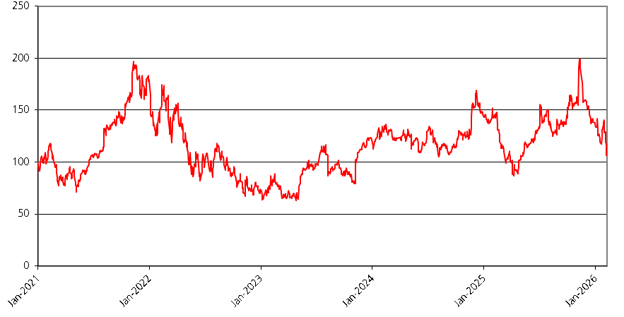 The following graph sets forth daily closing prices of the common stock of Datadog for the period from January 1, 2021 to February 6, 2026. The closing price on February 6, 2026 was $111.69. The historical performance of the Underlying Stock should not be taken as an indication of the future performance of the Underlying Stock during the term of the securities.