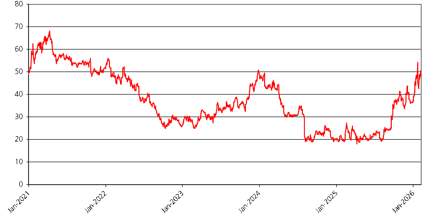 The following graph sets forth daily closing prices of the common stock of Intel for the period from January 1, 2021 to February 6, 2026. The closing price on February 6, 2026 was $50.59. The historical performance of the Underlying Stock should not be taken as an indication of the future performance of the Underlying Stock during the term of the securities.