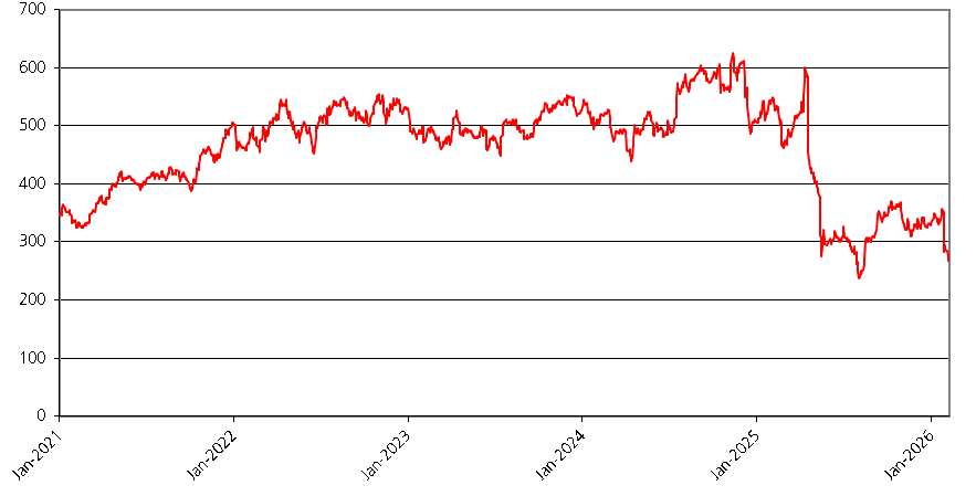 The following graph sets forth daily closing prices of the common stock of UnitedHealth Group for the period from January 1, 2021 to February 6, 2026. The closing price on February 6, 2026 was $276.65. The historical performance of the Underlying Stock should not be taken as an indication of the future performance of the Underlying Stock during the term of the securities.