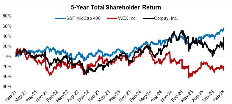 “As one of WEX’s largest and most committed investors, Impactive is fully aligned with the success of the Company. This is why for the past four years we have repeatedly sought to engage constructively with the Board to help close the gap between WEX’s intrinsic value and its stock price. Despite our best efforts, the Board has continued to dismiss our view that WEX’s long-term owners deserve meaningful representation in the boardroom to hold management accountable and drive improved operating performance. Without oversight by shareholders, the outcomes have been both predictable and deeply disappointing, and the widening gap versus its closest peer, Corpay, Inc. (NYSE: CPAY), is increasingly alarming. Over the last five years, WEX has trailed Corpay by 58% and underperformed the S&P MidCap 400 by 76%.1 More recently, over the past three years, it has underperformed Corpay by 81% and the S&P MidCap 400 by 52%.