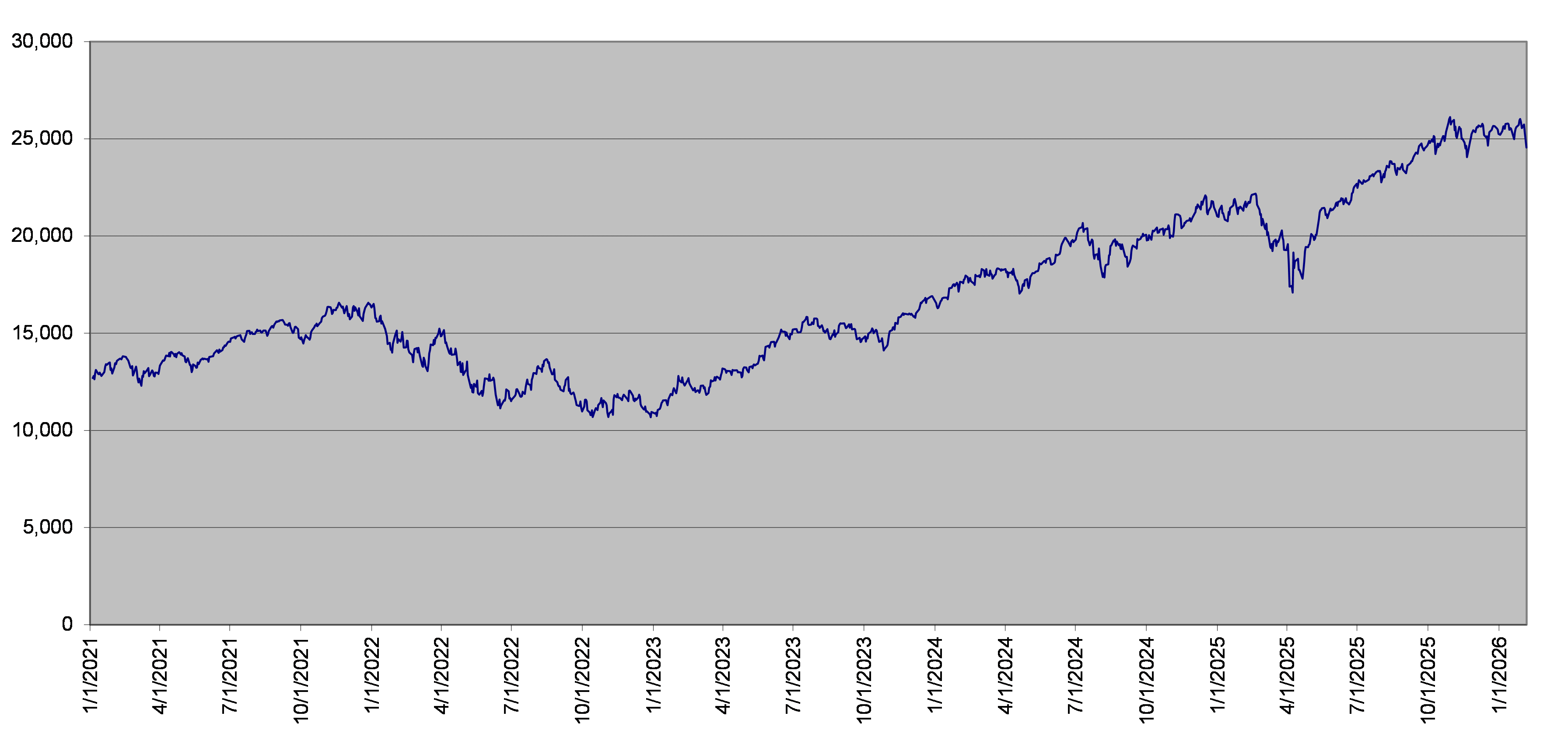 NDX Index Daily Closing Levels January 1, 2021 to February 5, 2026 |