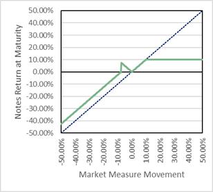 · 1-to-1 upside exposure to increases in the Market Measure, subject to the Capped Value · A positive return equal to the absolute value of the percentage decline in the Market Measure only if the Market Measure does not decline by more than [5.00% to 9.00%] (e.g., if the negative return of the Market Measure is -3%, you will receive a positive return of +3%) · 1-to-1 downside exposure to decreases in the Market Measure beyond a [5.00% to 9.00%] decline, with [95.00% to 91.00%] of your principal at risk |