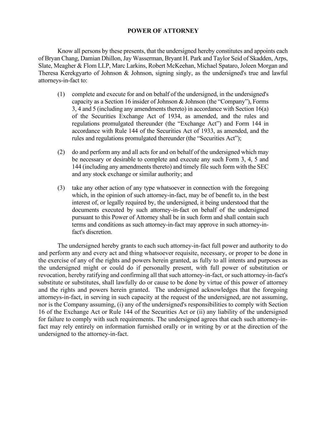 POWER OF ATTORNEY Know all persons by these presents, that the undersigned hereby constitutes and appoints each of Bryan Chang, Damian Dhillon, Jay Wasserman, Bryant H. Park and Taylor Seid of Skadden, Arps, Slate, Meagher & Flom LLP, Marc Larkins, Robert McKeehan, Michael Spataro, Joleen Morgan and Theresa Kerekgyarto of Johnson & Johnson, signing singly, as the undersigned's true and lawful attorneys-in-fact to: (1) complete and execute for and on behalf of the undersigned, in the undersigned's capacity as a Section 16 insider of Johnson & Johnson (the “Company”), Forms 3, 4 and 5 (including any amendments thereto) in accordance with Section 16(a) of the Securities Exchange Act of 1934, as amended, and the rules and regulations promulgated thereunder (the “Exchange Act”) and Form 144 in accordance with Rule 144 of the Securities Act of 1933, as amended, and the rules and regulations promulgated thereunder (the “Securities Act”); (2) do and perform any and all acts for and on behalf of the undersigned which may be necessary or desirable to complete and execute any such Form 3, 4, 5 and 144 (including any amendments thereto) and timely file such form with the SEC and any stock exchange or similar authority; and (3) take any other action of any type whatsoever in connection with the foregoing which, in the opinion of such attorney-in-fact, may be of benefit to, in the best interest of, or legally required by, the undersigned, it being understood that the documents executed by such attorney-in-fact on behalf of the undersigned pursuant to this Power of Attorney shall be in such form and shall contain such terms and conditions as such attorney-in-fact may approve in such attorney-in- fact's discretion. The undersigned hereby grants to each such attorney-in-fact full power and authority to do and perform any and every act and thing whatsoever requisite, necessary, or proper to be done in the exercise of any of the rights and powers herein granted, as fully to all intents and purposes as the undersigned might or could do if personally present, with full power of substitution or revocation, hereby ratifying and confirming all that such attorney-in-fact, or such attorney-in-fact's substitute or substitutes, shall lawfully do or cause to be done by virtue of this power of attorney and the rights and powers herein granted. The undersigned acknowledges that the foregoing attorneys-in-fact, in serving in such capacity at the request of the undersigned, are not assuming, nor is the Company assuming, (i) any of the undersigned's responsibilities to comply with Section 16 of the Exchange Act or Rule 144 of the Securities Act or (ii) any liability of the undersigned for failure to comply with such requirements. The undersigned agrees that each such attorney-in- fact may rely entirely on information furnished orally or in writing by or at the direction of the undersigned to the attorney-in-fact.
