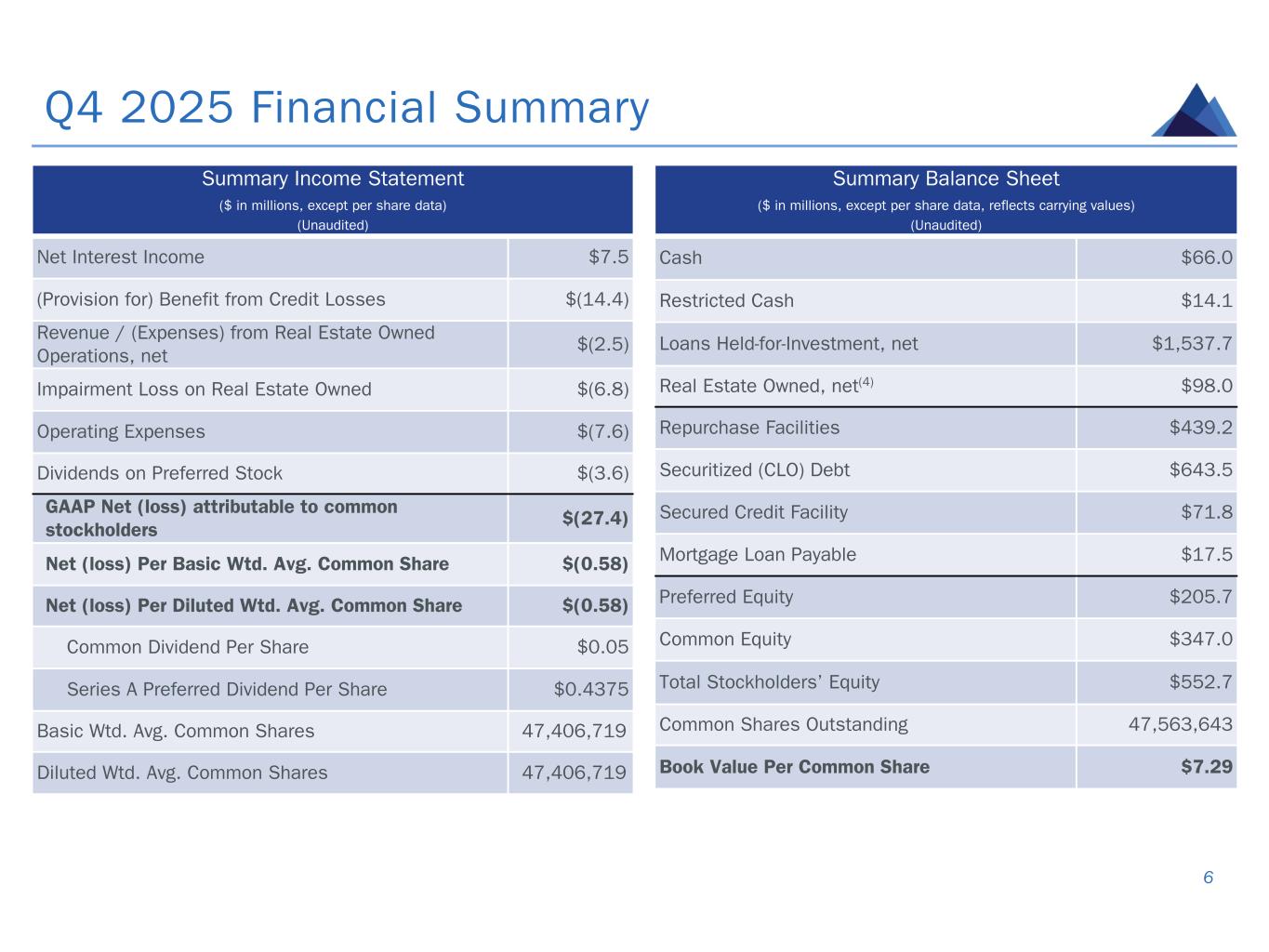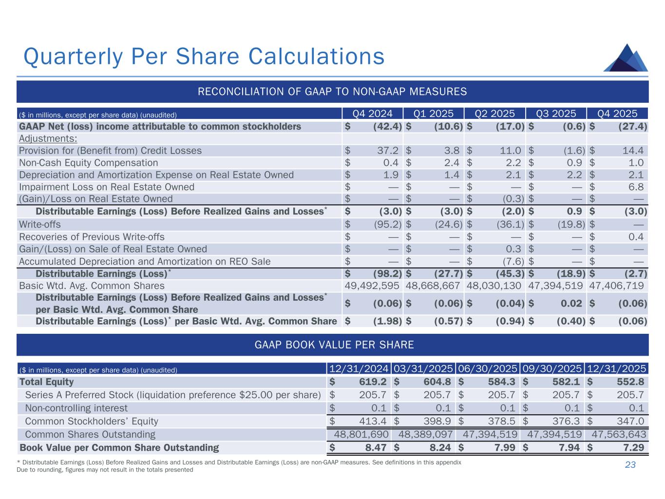 Quarterly Per Share Calculations 23 ($ in millions, except per share data) (unaudited) Q4 2024 Q1 2025 Q2 2025 Q3 2025 Q4 2025 GAAP Net (loss) income attributable to common stockholders $ (42.4) $ (10.6) $ (17.0) $ (0.6) $ (27.4) Adjustments: Provision for (Benefit from) Credit Losses $ 37.2 $ 3.8 $ 11.0 $ (1.6) $ 14.4 Non-Cash Equity Compensation $ 0.4 $ 2.4 $ 2.2 $ 0.9 $ 1.0 Depreciation and Amortization Expense on Real Estate Owned $ 1.9 $ 1.4 $ 2.1 $ 2.2 $ 2.1 Impairment Loss on Real Estate Owned $ — $ — $ — $ — $ 6.8 (Gain)/Loss on Real Estate Owned $ — $ — $ (0.3) $ — $ — Distributable Earnings (Loss) Before Realized Gains and Losses* $ (3.0) $ (3.0) $ (2.0) $ 0.9 $ (3.0) Write-offs $ (95.2) $ (24.6) $ (36.1) $ (19.8) $ — Recoveries of Previous Write-offs $ — $ — $ — $ — $ 0.4 Gain/(Loss) on Sale of Real Estate Owned $ — $ — $ 0.3 $ — $ — Accumulated Depreciation and Amortization on REO Sale $ — $ — $ (7.6) $ — $ — Distributable Earnings (Loss)* $ (98.2) $ (27.7) $ (45.3) $ (18.9) $ (2.7) Basic Wtd. Avg. Common Shares 49,492,595 48,668,667 48,030,130 47,394,519 47,406,719 Distributable Earnings (Loss) Before Realized Gains and Losses* per Basic Wtd. Avg. Common Share $ (0.06) $ (0.06) $ (0.04) $ 0.02 $ (0.06) Distributable Earnings (Loss)* per Basic Wtd. Avg. Common Share $ (1.98) $ (0.57) $ (0.94) $ (0.40) $ (0.06) * Distributable Earnings (Loss) Before Realized Gains and Losses and Distributable Earnings (Loss) are non-GAAP measures. See definitions in this appendix Due to rounding, figures may not result in the totals presented GAAP BOOK VALUE PER SHARE ($ in millions, except per share data) (unaudited) 12/31/2024 03/31/2025 06/30/2025 09/30/2025 12/31/2025 Total Equity $ 619.2 $ 604.8 $ 584.3 $ 582.1 $ 552.8 Series A Preferred Stock (liquidation preference $25.00 per share) $ 205.7 $ 205.7 $ 205.7 $ 205.7 $ 205.7 Non-controlling interest $ 0.1 $ 0.1 $ 0.1 $ 0.1 $ 0.1 Common Stockholders’ Equity $ 413.4 $ 398.9 $ 378.5 $ 376.3 $ 347.0 Common Shares Outstanding 48,801,690 48,389,097 47,394,519 47,394,519 47,563,643 Book Value per Common Share Outstanding $ 8.47 $ 8.24 $ 7.99 $ 7.94 $ 7.29 RECONCILIATION OF GAAP TO NON-GAAP MEASURES