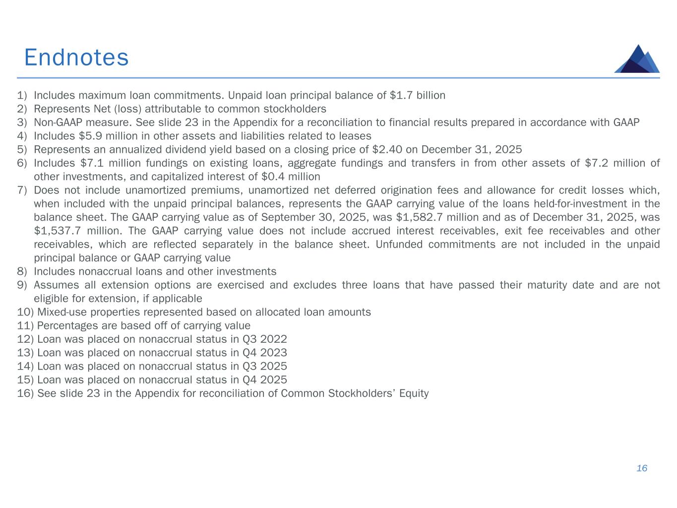 Endnotes 1) Includes maximum loan commitments. Unpaid loan principal balance of $1.7 billion 2) Represents Net (loss) attributable to common stockholders 3) Non-GAAP measure. See slide 23 in the Appendix for a reconciliation to financial results prepared in accordance with GAAP 4) Includes $5.9 million in other assets and liabilities related to leases 5) Represents an annualized dividend yield based on a closing price of $2.40 on December 31, 2025 6) Includes $7.1 million fundings on existing loans, aggregate fundings and transfers in from other assets of $7.2 million of other investments, and capitalized interest of $0.4 million 7) Does not include unamortized premiums, unamortized net deferred origination fees and allowance for credit losses which, when included with the unpaid principal balances, represents the GAAP carrying value of the loans held-for-investment in the balance sheet. The GAAP carrying value as of September 30, 2025, was $1,582.7 million and as of December 31, 2025, was $1,537.7 million. The GAAP carrying value does not include accrued interest receivables, exit fee receivables and other receivables, which are reflected separately in the balance sheet. Unfunded commitments are not included in the unpaid principal balance or GAAP carrying value 8) Includes nonaccrual loans and other investments 9) Assumes all extension options are exercised and excludes three loans that have passed their maturity date and are not eligible for extension, if applicable 10) Mixed-use properties represented based on allocated loan amounts 11) Percentages are based off of carrying value 12) Loan was placed on nonaccrual status in Q3 2022 13) Loan was placed on nonaccrual status in Q4 2023 14) Loan was placed on nonaccrual status in Q3 2025 15) Loan was placed on nonaccrual status in Q4 2025 16) See slide 23 in the Appendix for reconciliation of Common Stockholders’ Equity 16