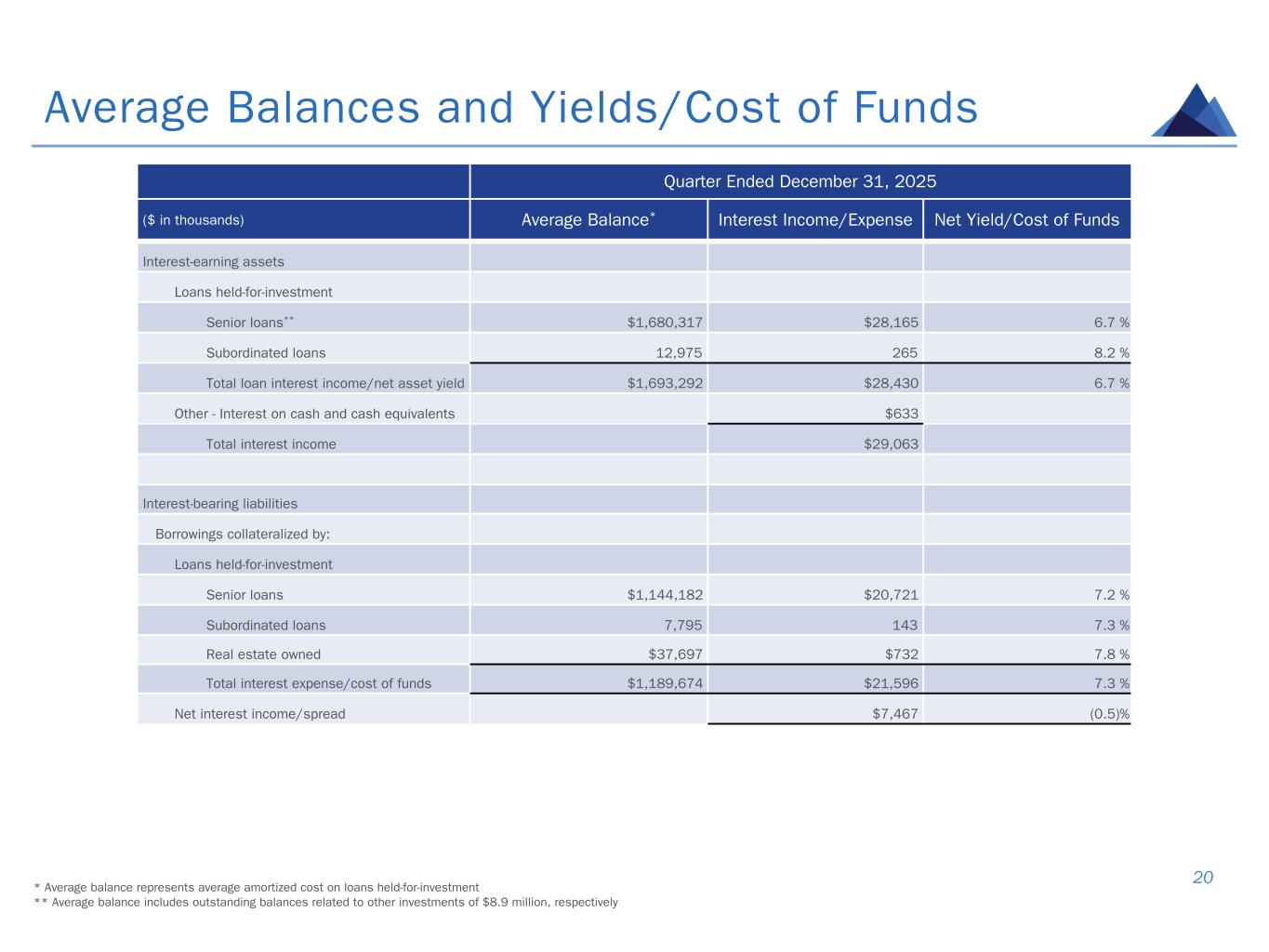 Average Balances and Yields/Cost of Funds 20 Quarter Ended December 31, 2025 ($ in thousands) Average Balance* Interest Income/Expense Net Yield/Cost of Funds Interest-earning assets Loans held-for-investment Senior loans** $1,680,317 $28,165 6.7 % Subordinated loans 12,975 265 8.2 % Total loan interest income/net asset yield $1,693,292 $28,430 6.7 % Other - Interest on cash and cash equivalents $633 Total interest income $29,063 Interest-bearing liabilities Borrowings collateralized by: Loans held-for-investment Senior loans $1,144,182 $20,721 7.2 % Subordinated loans 7,795 143 7.3 % Real estate owned $37,697 $732 7.8 % Total interest expense/cost of funds $1,189,674 $21,596 7.3 % Net interest income/spread $7,467 (0.5) % * Average balance represents average amortized cost on loans held-for-investment ** Average balance includes outstanding balances related to other investments of $8.9 million, respectively