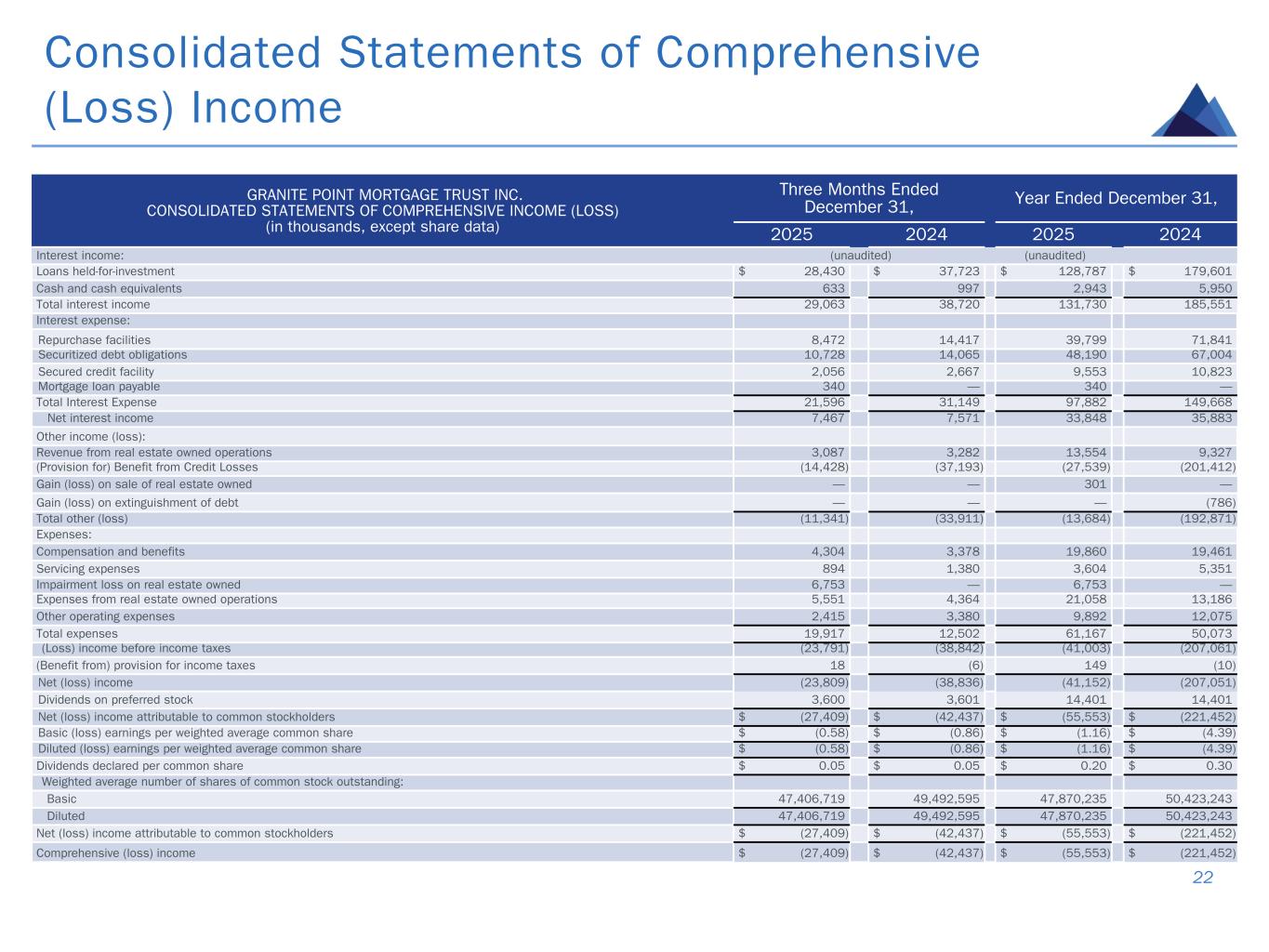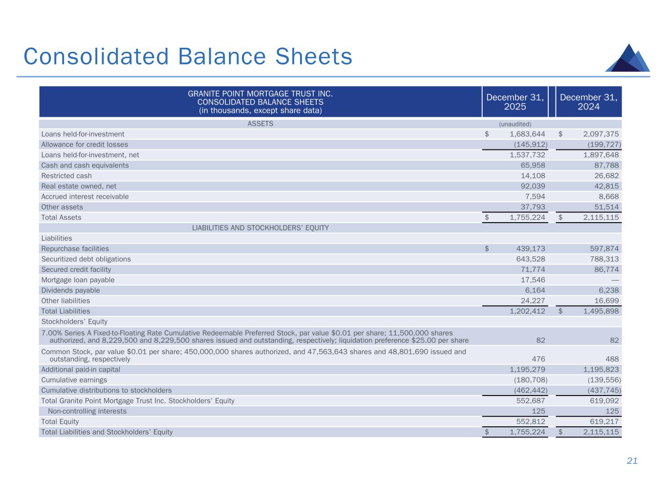 Consolidated Balance Sheets 21 GRANITE POINT MORTGAGE TRUST INC. CONSOLIDATED BALANCE SHEETS (in thousands, except share data) December 31, 2025 December 31, 2024 ASSETS (unaudited) Loans held-for-investment $ 1,683,644 $ 2,097,375 Allowance for credit losses (145,912) (199,727) Loans held-for-investment, net 1,537,732 1,897,648 Cash and cash equivalents 65,958 87,788 Restricted cash 14,108 26,682 Real estate owned, net 92,039 42,815 Accrued interest receivable 7,594 8,668 Other assets 37,793 51,514 Total Assets $ 1,755,224 $ 2,115,115 LIABILITIES AND STOCKHOLDERS’ EQUITY Liabilities Repurchase facilities $ 439,173 597,874 Securitized debt obligations 643,528 788,313 Secured credit facility 71,774 86,774 Mortgage loan payable 17,546 — Dividends payable 6,164 6,238 Other liabilities 24,227 16,699 Total Liabilities 1,202,412 $ 1,495,898 Stockholders’ Equity 7.00% Series A Fixed-to-Floating Rate Cumulative Redeemable Preferred Stock, par value $0.01 per share; 11,500,000 shares authorized, and 8,229,500 and 8,229,500 shares issued and outstanding, respectively; liquidation preference $25.00 per share 82 82 Common Stock, par value $0.01 per share; 450,000,000 shares authorized, and 47,563,643 shares and 48,801,690 issued and outstanding, respectively 476 488 Additional paid-in capital 1,195,279 1,195,823 Cumulative earnings (180,708) (139,556) Cumulative distributions to stockholders (462,442) (437,745) Total Granite Point Mortgage Trust Inc. Stockholders’ Equity 552,687 619,092 Non-controlling interests 125 125 Total Equity 552,812 619,217 Total Liabilities and Stockholders’ Equity $ 1,755,224 $ 2,115,115