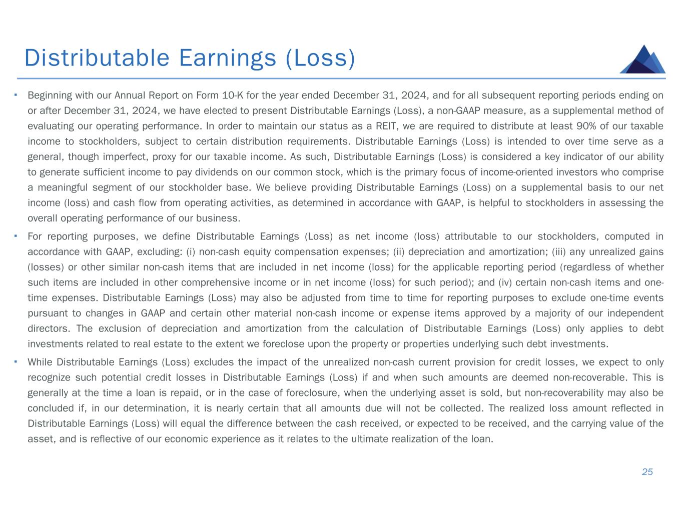 ▪ Beginning with our Annual Report on Form 10-K for the year ended December 31, 2024, and for all subsequent reporting periods ending on or after December 31, 2024, we have elected to present Distributable Earnings (Loss), a non-GAAP measure, as a supplemental method of evaluating our operating performance. In order to maintain our status as a REIT, we are required to distribute at least 90% of our taxable income to stockholders, subject to certain distribution requirements. Distributable Earnings (Loss) is intended to over time serve as a general, though imperfect, proxy for our taxable income. As such, Distributable Earnings (Loss) is considered a key indicator of our ability to generate sufficient income to pay dividends on our common stock, which is the primary focus of income-oriented investors who comprise a meaningful segment of our stockholder base. We believe providing Distributable Earnings (Loss) on a supplemental basis to our net income (loss) and cash flow from operating activities, as determined in accordance with GAAP, is helpful to stockholders in assessing the overall operating performance of our business. ▪ For reporting purposes, we define Distributable Earnings (Loss) as net income (loss) attributable to our stockholders, computed in accordance with GAAP, excluding: (i) non-cash equity compensation expenses; (ii) depreciation and amortization; (iii) any unrealized gains (losses) or other similar non-cash items that are included in net income (loss) for the applicable reporting period (regardless of whether such items are included in other comprehensive income or in net income (loss) for such period); and (iv) certain non-cash items and one- time expenses. Distributable Earnings (Loss) may also be adjusted from time to time for reporting purposes to exclude one-time events pursuant to changes in GAAP and certain other material non-cash income or expense items approved by a majority of our independent directors. The exclusion of depreciation and amortization from the calculation of Distributable Earnings (Loss) only applies to debt investments related to real estate to the extent we foreclose upon the property or properties underlying such debt investments. ▪ While Distributable Earnings (Loss) excludes the impact of the unrealized non-cash current provision for credit losses, we expect to only recognize such potential credit losses in Distributable Earnings (Loss) if and when such amounts are deemed non-recoverable. This is generally at the time a loan is repaid, or in the case of foreclosure, when the underlying asset is sold, but non-recoverability may also be concluded if, in our determination, it is nearly certain that all amounts due will not be collected. The realized loss amount reflected in Distributable Earnings (Loss) will equal the difference between the cash received, or expected to be received, and the carrying value of the asset, and is reflective of our economic experience as it relates to the ultimate realization of the loan. Distributable Earnings (Loss) 25
