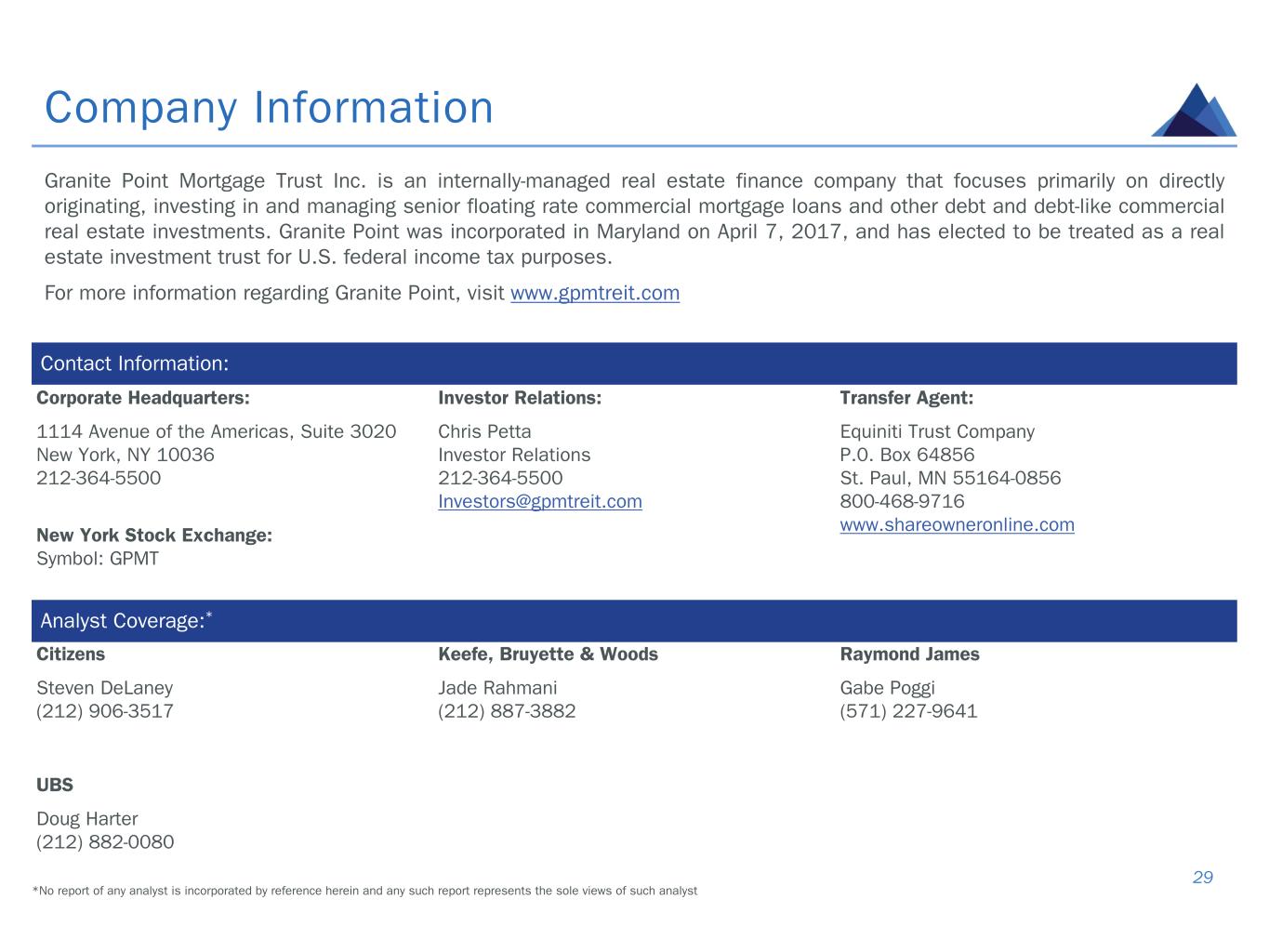 Company Information 29 Granite Point Mortgage Trust Inc. is an internally-managed real estate finance company that focuses primarily on directly originating, investing in and managing senior floating rate commercial mortgage loans and other debt and debt-like commercial real estate investments. Granite Point was incorporated in Maryland on April 7, 2017, and has elected to be treated as a real estate investment trust for U.S. federal income tax purposes. For more information regarding Granite Point, visit www.gpmtreit.com Contact Information: Corporate Headquarters: 1114 Avenue of the Americas, Suite 3020 New York, NY 10036 212-364-5500 New York Stock Exchange: Symbol: GPMT Investor Relations: Chris Petta Investor Relations 212-364-5500 Investors@gpmtreit.com Transfer Agent: Equiniti Trust Company P.0. Box 64856 St. Paul, MN 55164-0856 800-468-9716 www.shareowneronline.com Citizens Steven DeLaney (212) 906-3517 Keefe, Bruyette & Woods Jade Rahmani (212) 887-3882 Raymond James Gabe Poggi (571) 227-9641 UBS Doug Harter (212) 882-0080 Analyst Coverage:* *No report of any analyst is incorporated by reference herein and any such report represents the sole views of such analyst