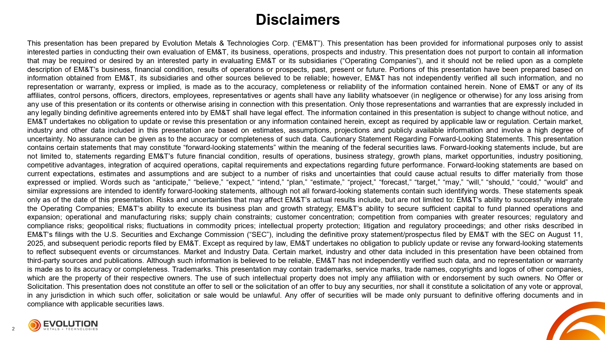 2 Disclaimers This presentation has been prepared by Evolution Metals & Technologies Corp . (“EM&T”) . This presentation has been provided for informational purposes only to assist interested parties in conducting their own evaluation of EM&T, its business, operations, prospects and industry . This presentation does not purport to contain all information that may be required or desired by an interested party in evaluating EM&T or its subsidiaries (“Operating Companies”), and it should not be relied upon as a complete description of EM&T’s business, financial condition, results of operations or prospects, past, present or future . Portions of this presentation have been prepared based on information obtained from EM&T, its subsidiaries and other sources believed to be reliable ; however, EM&T has not independently verified all such information, and no representation or warranty, express or implied, is made as to the accuracy, completeness or reliability of the information contained herein . None of EM&T or any of its affiliates, control persons, officers, directors, employees, representatives or agents shall have any liability whatsoever (in negligence or otherwise) for any loss arising from any use of this presentation or its contents or otherwise arising in connection with this presentation . Only those representations and warranties that are expressly included in any legally binding definitive agreements entered into by EM&T shall have legal effect . The information contained in this presentation is subject to change without notice, and EM&T undertakes no obligation to update or revise this presentation or any information contained herein, except as required by applicable law or regulation . Certain market, industry and other data included in this presentation are based on estimates, assumptions, projections and publicly available information and involve a high degree of uncertainty . No assurance can be given as to the accuracy or completeness of such data . Cautionary Statement Regarding Forward - Looking Statements . This presentation contains certain statements that may constitute “forward - looking statements” within the meaning of the federal securities laws . Forward - looking statements include, but are not limited to, statements regarding EM&T’s future financial condition, results of operations, business strategy, growth plans, market opportunities, industry positioning, competitive advantages, integration of acquired operations, capital requirements and expectations regarding future performance . Forward - looking statements are based on current expectations, estimates and assumptions and are subject to a number of risks and uncertainties that could cause actual results to differ materially from those expressed or implied . Words such as “anticipate,” “believe,” “expect,” “intend,” “plan,” “estimate,” “project,” “forecast,” “target,” “may,” “will,” “should,” “could,” “would” and similar expressions are intended to identify forward - looking statements, although not all forward - looking statements contain such identifying words . These statements speak only as of the date of this presentation . Risks and uncertainties that may affect EM&T’s actual results include, but are not limited to : EM&T’s ability to successfully integrate the Operating Companies ; EM&T’s ability to execute its business plan and growth strategy ; EM&T’s ability to secure sufficient capital to fund planned operations and expansion ; operational and manufacturing risks ; supply chain constraints ; customer concentration ; competition from companies with greater resources ; regulatory and compliance risks ; geopolitical risks ; fluctuations in commodity prices ; intellectual property protection ; litigation and regulatory proceedings ; and other risks described in EM&T’s filings with the U . S . Securities and Exchange Commission (“SEC”), including the definitive proxy statement/prospectus filed by EM&T with the SEC on August 11 , 2025 , and subsequent periodic reports filed by EM&T . Except as required by law, EM&T undertakes no obligation to publicly update or revise any forward - looking statements to reflect subsequent events or circumstances . Market and Industry Data . Certain market, industry and other data included in this presentation have been obtained from third - party sources and publications . Although such information is believed to be reliable, EM&T has not independently verified such data, and no representation or warranty is made as to its accuracy or completeness . Trademarks . This presentation may contain trademarks, service marks, trade names, copyrights and logos of other companies, which are the property of their respective owners . The use of such intellectual property does not imply any affiliation with or endorsement by such owners . No Offer or Solicitation . This presentation does not constitute an offer to sell or the solicitation of an offer to buy any securities, nor shall it constitute a solicitation of any vote or approval, in any jurisdiction in which such offer, solicitation or sale would be unlawful . Any offer of securities will be made only pursuant to definitive offering documents and in compliance with applicable securities laws .