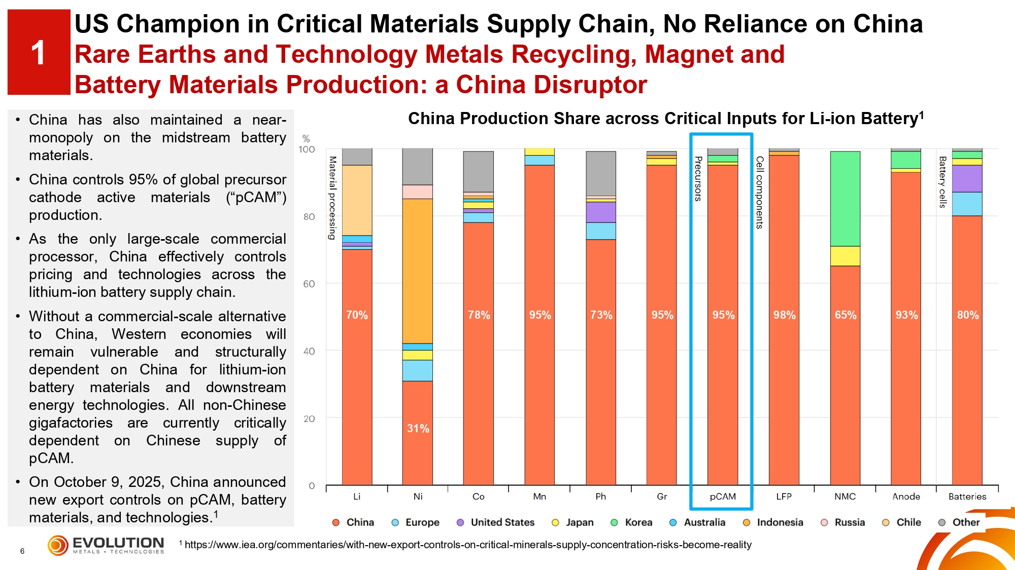 6 1 https://www.iea.org/commentaries/with - new - export - controls - on - critical - minerals - supply - concentration - risks - become - reality 70% 95% 80% 93% 31% 78% 95% 73% 95% 98% 65% • China has also maintained a near - monopoly on the midstream battery materials . • China controls 95 % of global precursor cathode active materials (“pCAM”) production . • As the only large - scale commercial processor, China effectively controls pricing and technologies across the lithium - ion battery supply chain . • Without a commercial - scale alternative to China, Western economies will remain vulnerable and structurally dependent on China for lithium - ion battery materials and downstream energy technologies . All non - Chinese are currently critically on Chinese supply of gigafactories dependent pCAM. • On October 9 , 2025 , China announced new export controls on pCAM, battery materials, and technologies . 1 US Champion in Critical Materials Supply Chain, No Reliance on China Rare Earths and Technology Metals Recycling, Magnet and Battery Materials Production: a China Disruptor 1 China Production Share across Critical Inputs for Li - ion Battery 1