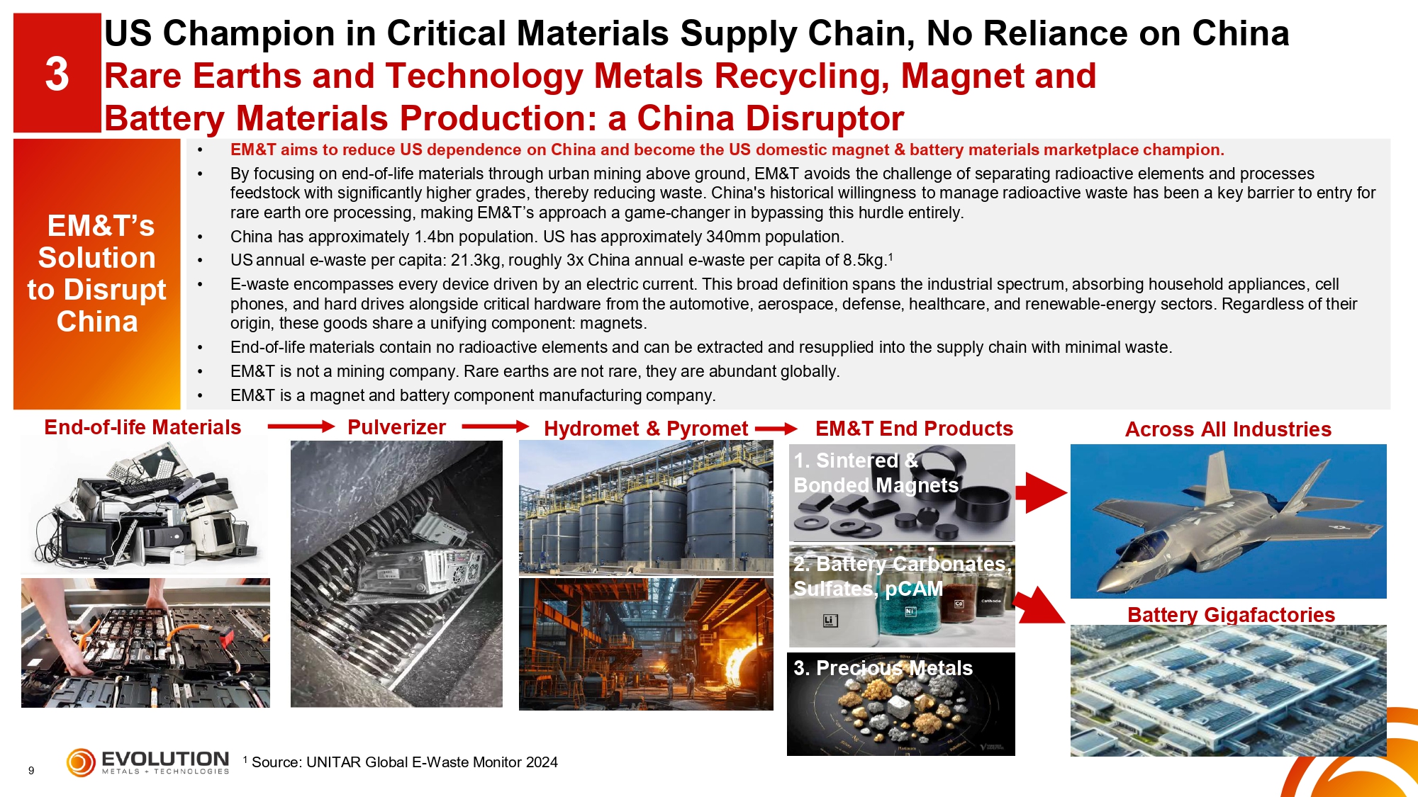 22 • Manufacturers need to purchase products in the final form that replicates what China supplies today, not intermediate products. • Carbonates, sulfates, pCAM and magnets are the necessary critical final form supply products which manufacturers currently purchase from China for a considerable number of US and Allied Nations’ manufacturing industries. • These manufacturing industries include, but are not limited to, the automotive, aerospace, defense, healthcare, high tech, consumer electronics and appliances, energy storage systems, and renewable energy industries. • Work with allied nations while the U.S. is building out its manufacturing infrastructure (made in USA intermediate products can be refined or finished in allied nations for direct input into supply chains) thereby excluding China. • Operating companies in Korea will be expanded into a singular US industrial campus. • All technologies utilized by EM&T are based on proven commercial - scale processes and/or are currently operating successfully in Korea, ensuring reliability and scalability with minimal technology risk. • EM&T implements automation technologies through smart machines across EM&T’s operations to reduce costs and increase efficiency. • EM&T utilizes AI in conjunction with smart machines to further develop industrial automation for EM&T’s facilities. • EM&T plans to build and scale in the US industrial campus with hydrometallurgical and pyrometallurgical facilities, closing the final gap in the midstream to become entirely self sufficient for numerous Western industries, including, but not limited to, the automotive, aerospace, defense, healthcare, high tech, consumer electronics and appliances, energy storage systems, and renewable energy industries . • EM&T focuses on urban above - ground mining, recovering and reintroducing rare earth and critical materials from e - waste and Li - ion batteries back into the supply chain. • EM&T is replicating the base and precious secondary metals business model for critical materials. • There is a substantial amount of available e - waste feed material from the US Government and the DoW, including its agencies. • There are also commercially available end - of - life materials from many sectors, including, but not limited to, the automotive and battery sectors with a significant supply of end - of - life EV Li - ion batteries expected in 2030. • Recycling end - of - life materials, which typically contain higher concentrations of critical metals than ores, reduces mining and import costs while leveraging local supply chains and efficient technologies to disrupt China’s midstream processing . • EM&T reduces virgin mining and minimizes environmental impact ; provides critical materials for the energy storage system industry, which is the key for growth in renewable energy ; and reduces Western and Allied Nations’ reliance on Chinese supplied critical materials, which exploit emerging/frontier markets using child labor and black - market supply . How Can EM&T Compete with China? 8 Business Model Driven by End - of - Life Materials Proven Operations, Proven Technologies Critical Materials Supply Chain Alternative to China