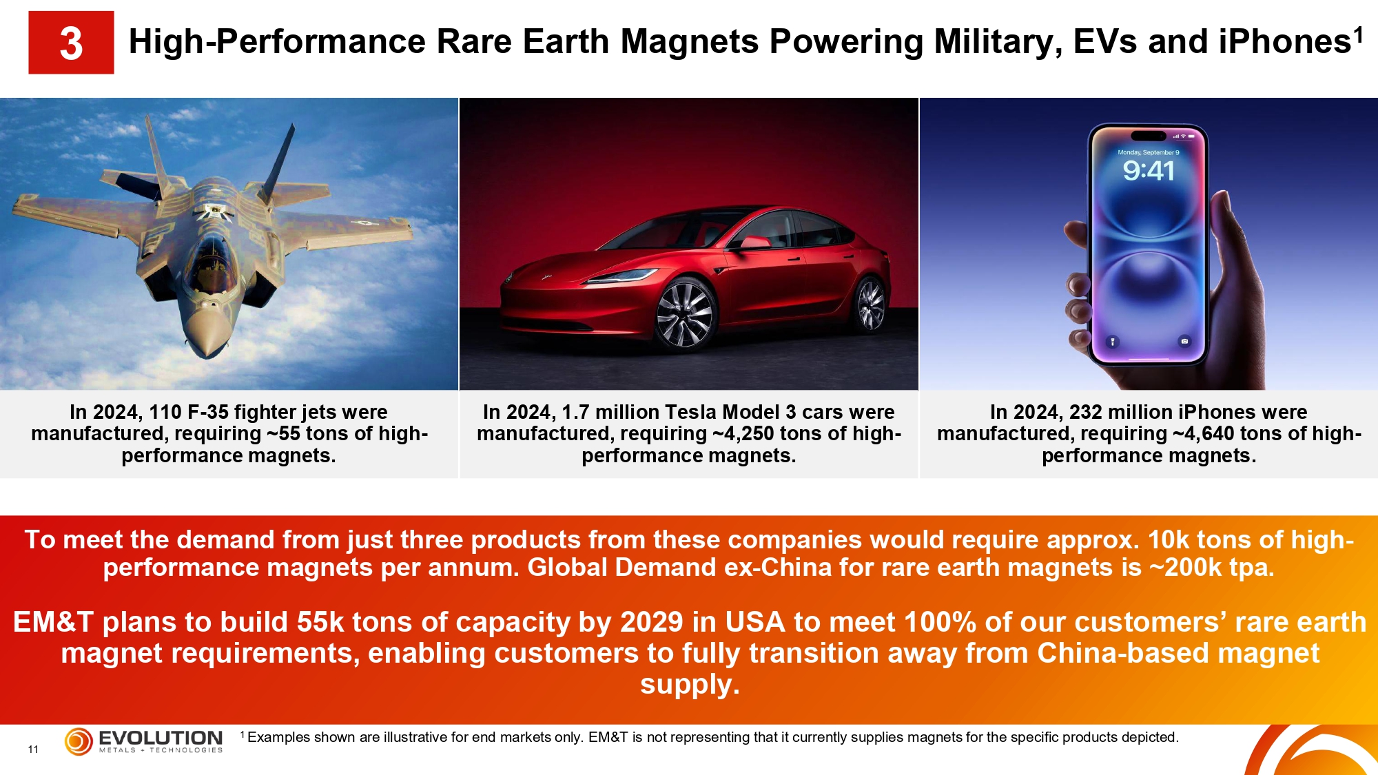 11 High - Performance Rare Earth Magnets Powering Military, EVs and iPhones 1 In 2024, 110 F - 35 fighter jets were manufactured, requiring ~55 tons of high - performance magnets. In 2024, 1.7 million Tesla Model 3 cars were manufactured, requiring ~4,250 tons of high - performance magnets. In 2024, 232 million iPhones were manufactured, requiring ~4,640 tons of high - performance magnets. To meet the demand from just three products from these companies would require approx. 10k tons of high - performance magnets per annum. Global Demand ex - China for rare earth magnets is ~200k tpa. EM&T plans to build 55k tons of capacity by 2029 in USA to meet 100% of our customers’ rare earth magnet requirements, enabling customers to fully transition away from China - based magnet supply. 3 1 Examples shown are illustrative for end markets only. EM&T is not representing that it currently supplies magnets for the specific products depicted.
