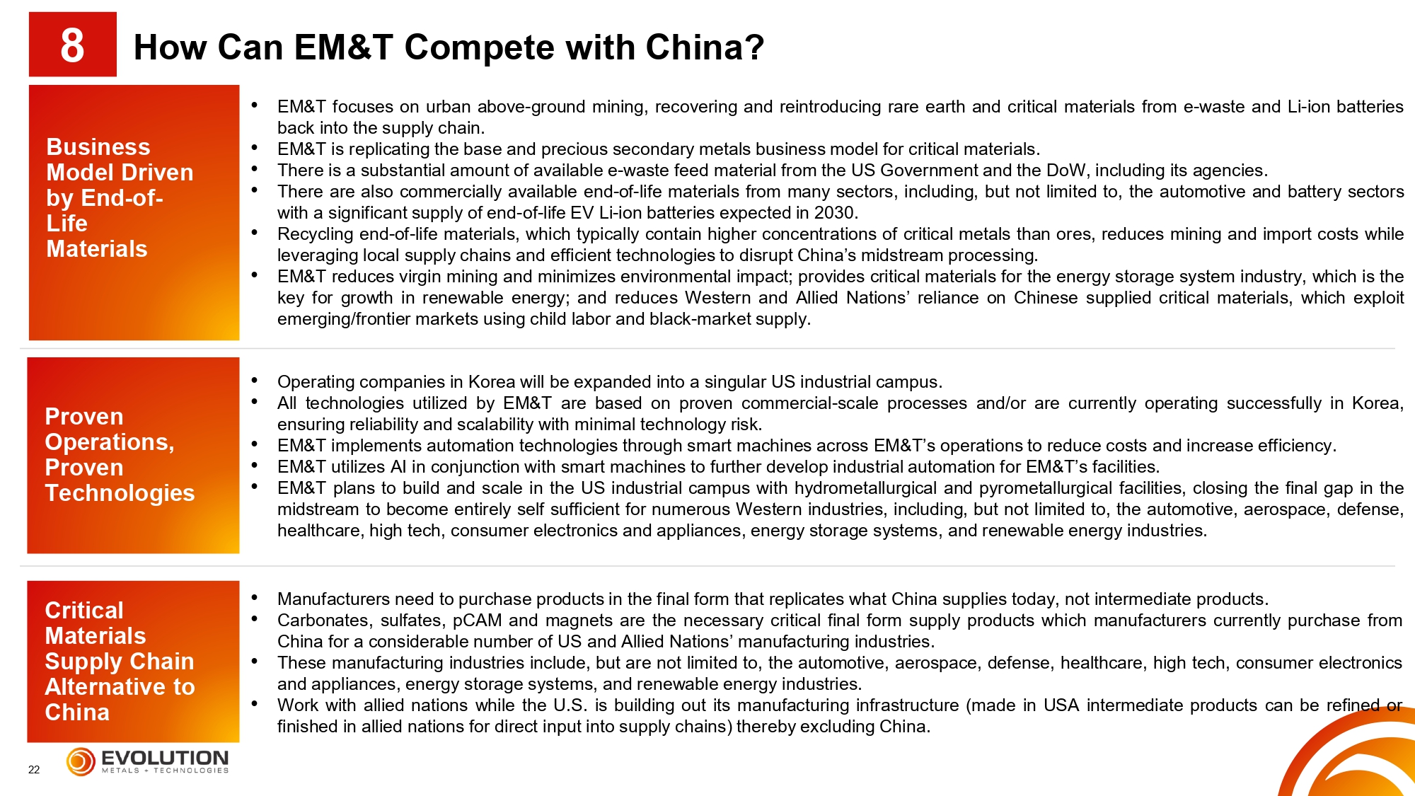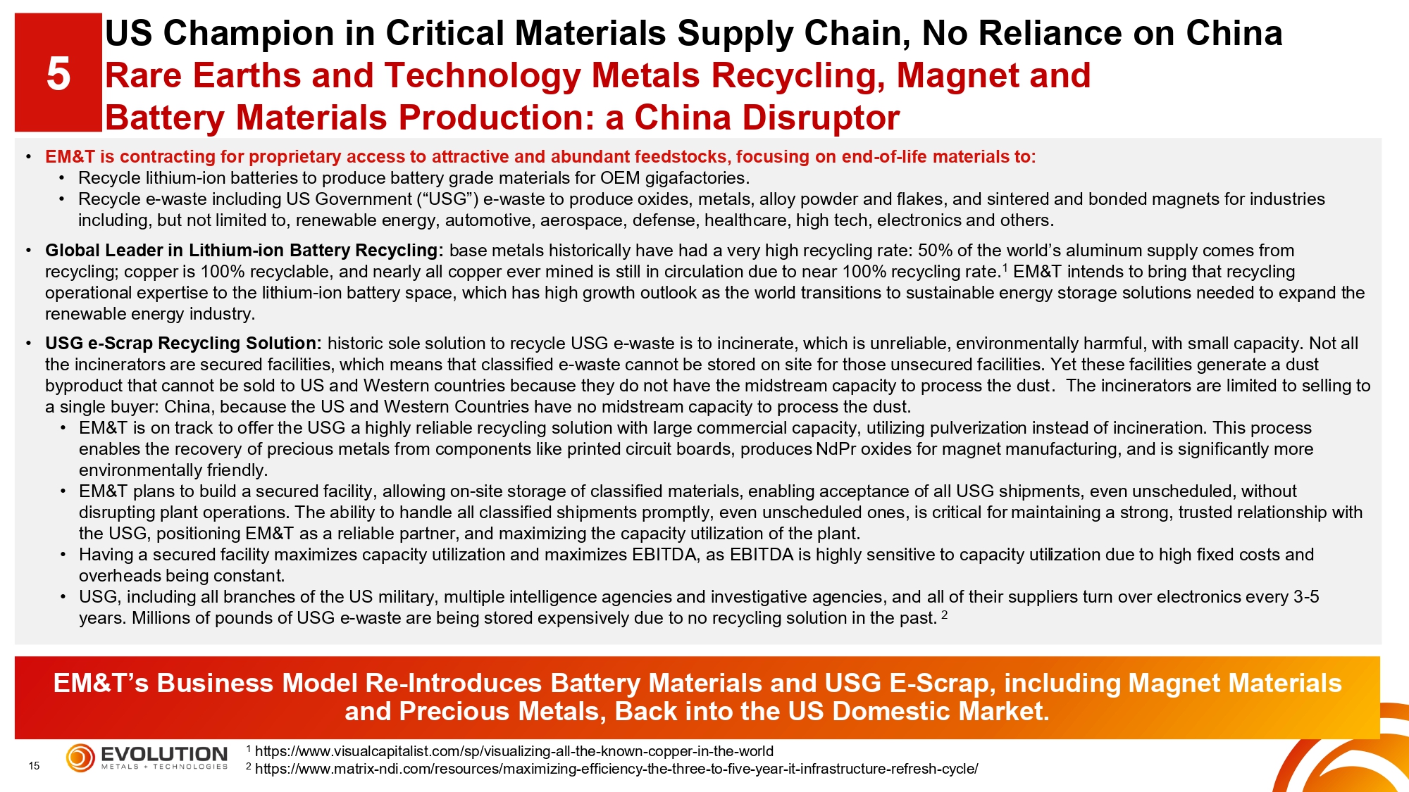 15 • EM&T is contracting for proprietary access to attractive and abundant feedstocks, focusing on end - of - life materials to: • Recycle lithium - ion batteries to produce battery grade materials for OEM gigafactories. • Recycle e - waste including US Government (“USG”) e - waste to produce oxides, metals, alloy powder and flakes, and sintered and bonded magnets for industries including, but not limited to, renewable energy, automotive, aerospace, defense, healthcare, high tech, electronics and others. • Global Leader in Lithium - ion Battery Recycling: base metals historically have had a very high recycling rate: 50% of the world’s aluminum supply comes from recycling; copper is 100% recyclable, and nearly all copper ever mined is still in circulation due to near 100% recycling rate. 1 EM&T intends to bring that recycling operational expertise to the lithium - ion battery space, which has high growth outlook as the world transitions to sustainable energy storage solutions needed to expand the renewable energy industry. • USG e - Scrap Recycling Solution: historic sole solution to recycle USG e - waste is to incinerate, which is unreliable, environmentally harmful, with small capacity. Not all the incinerators are secured facilities, which means that classified e - waste cannot be stored on site for those unsecured facilities. Yet these facilities generate a dust byproduct that cannot be sold to US and Western countries because they do not have the midstream capacity to process the dust. The incinerators are limited to selling to a single buyer: China, because the US and Western Countries have no midstream capacity to process the dust. • EM&T is on track to offer the USG a highly reliable recycling solution with large commercial capacity, utilizing pulverization instead of incineration . This process enables the recovery of precious metals from components like printed circuit boards, produces NdPr oxides for magnet manufacturing, and is significantly more environmentally friendly . • EM&T plans to build a secured facility, allowing on - site storage of classified materials, enabling acceptance of all USG shipments, even unscheduled, without disrupting plant operations. The ability to handle all classified shipments promptly, even unscheduled ones, is critical for maintaining a strong, trusted relationship with the USG, positioning EM&T as a reliable partner, and maximizing the capacity utilization of the plant. • Having a secured facility maximizes capacity utilization and maximizes EBITDA, as EBITDA is highly sensitive to capacity utilization due to high fixed costs and overheads being constant. • USG, including all branches of the US military, multiple intelligence agencies and investigative agencies, and all of their suppliers turn over electronics every 3 - 5 years. Millions of pounds of USG e - waste are being stored expensively due to no recycling solution in the past. 2 1 https://www.visualcapitalist.com/sp/visualizing - all - the - known - copper - in - the - world 2 https://www.matrix - ndi.com/resources/maximizing - efficiency - the - three - to - five - year - it - infrastructure - refresh - cycle/ US Champion in Critical Materials Supply Chain, No Reliance on China Rare Earths and Technology Metals Recycling, Magnet and Battery Materials Production: a China Disruptor 5 EM&T’s Business Model Re - Introduces Battery Materials and USG E - Scrap, including Magnet Materials and Precious Metals, Back into the US Domestic Market.