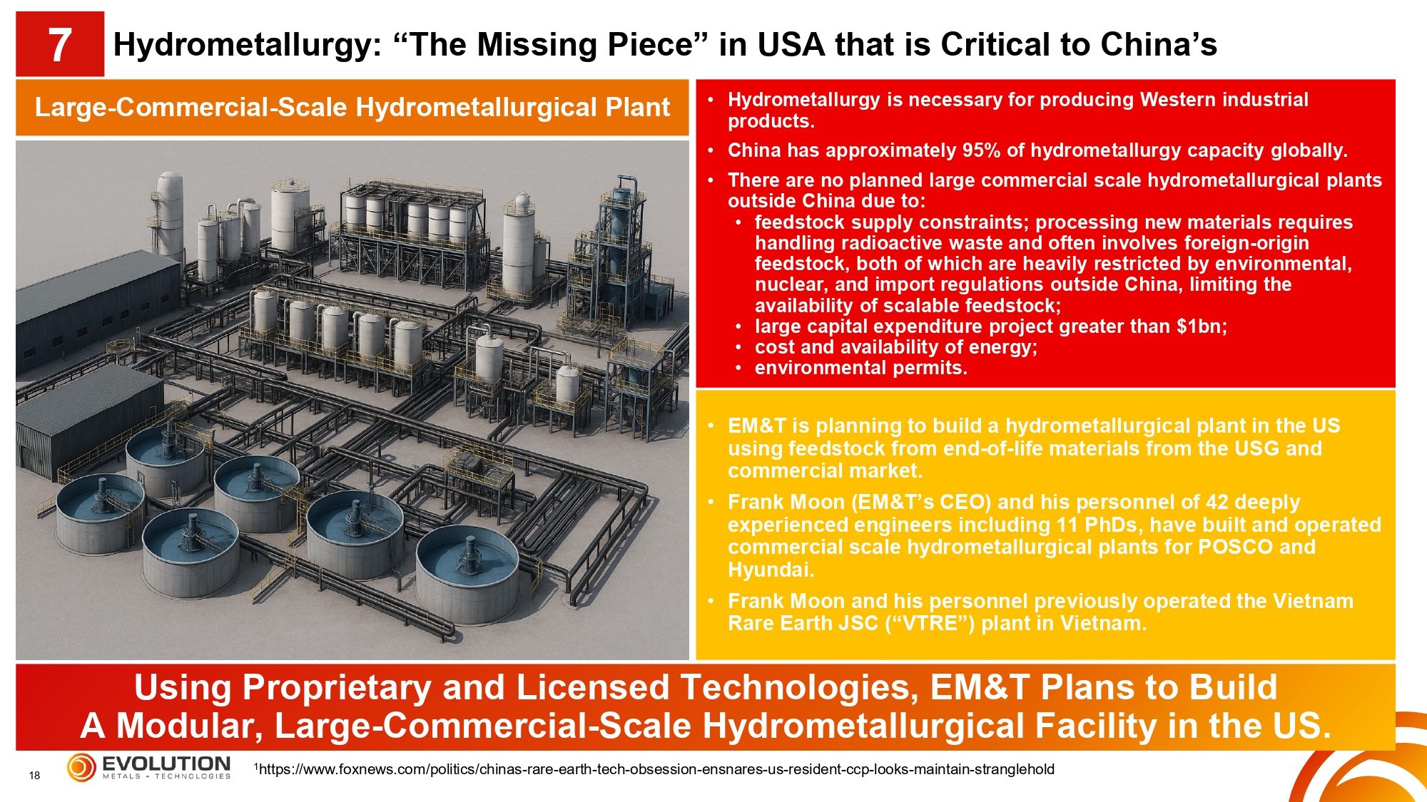 18 Using Proprietary and Licensed Technologies, EM&T Plans to Build A Modular, Large - Commercial - Scale Hydrometallurgical Facility in the US. Hydrometallurgy: “The Missing Piece” in USA that is Critical to China’s 7 • Hydrometallurgy is necessary for producing Western industrial products. • China has approximately 95% of hydrometallurgy capacity globally. • There are no planned large commercial scale hydrometallurgical plants outside China due to: • feedstock supply constraints; processing new materials requires handling radioactive waste and often involves foreign - origin feedstock, both of which are heavily restricted by environmental, nuclear, and import regulations outside China, limiting the availability of scalable feedstock; • large capital expenditure project greater than $1bn; • cost and availability of energy; • environmental permits. Large - Commercial - Scale Hydrometallurgical Plant • EM&T is planning to build a hydrometallurgical plant in the US using feedstock from end - of - life materials from the USG and commercial market. • Frank Moon (EM&T’s CEO) and his personnel of 42 deeply experienced engineers including 11 PhDs, have built and operated commercial scale hydrometallurgical plants for POSCO and Hyundai. • Frank Moon and his personnel previously operated the Vietnam Rare Earth JSC (“VTRE”) plant in Vietnam. 1 https://www.foxnews.com/politics/chinas - rare - earth - tech - obsession - ensnares - us - resident - ccp - looks - maintain - stranglehold