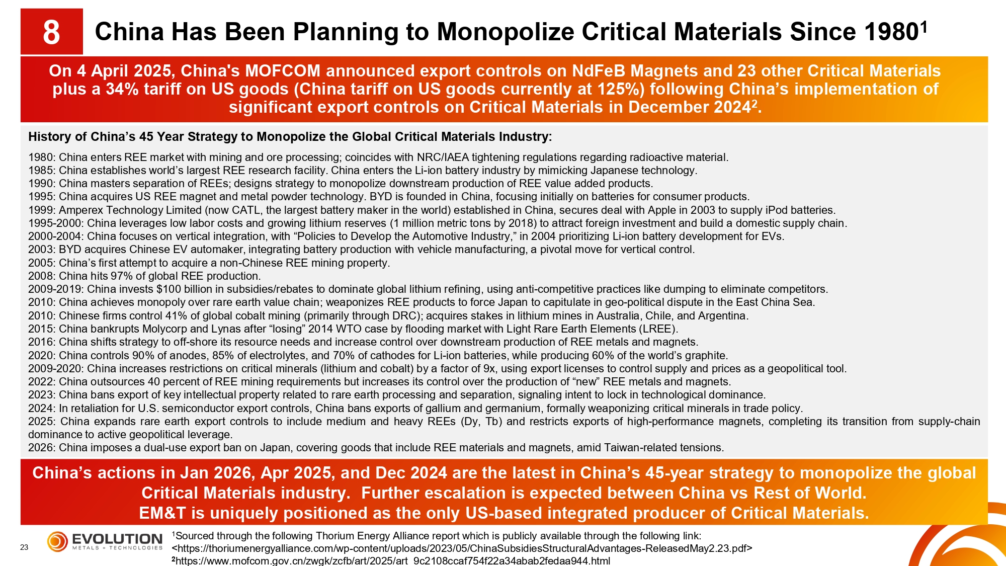 23 On 4 April 2025, China's MOFCOM announced export controls on NdFeB Magnets and 23 other Critical Materials plus a 34% tariff on US goods (China tariff on US goods currently at 125%) following China’s implementation of significant export controls on Critical Materials in December 2024 2 . China Has Been Planning to Monopolize Critical Materials Since 1980 1 8 History of China’s 45 Year Strategy to Monopolize the Global Critical Materials Industry: 1980: China enters REE market with mining and ore processing; coincides with NRC/IAEA tightening regulations regarding radioactive material. 1985: China establishes world’s largest REE research facility. China enters the Li - ion battery industry by mimicking Japanese technology. 1990: China masters separation of REEs; designs strategy to monopolize downstream production of REE value added products. 1995: China acquires US REE magnet and metal powder technology. BYD is founded in China, focusing initially on batteries for consumer products. 1999: Amperex Technology Limited (now CATL, the largest battery maker in the world) established in China, secures deal with Apple in 2003 to supply iPod batteries. 1995 - 2000: China leverages low labor costs and growing lithium reserves (1 million metric tons by 2018) to attract foreign investment and build a domestic supply chain. 2000 - 2004: China focuses on vertical integration, with “Policies to Develop the Automotive Industry,” in 2004 prioritizing Li - ion battery development for EVs. 2003: BYD acquires Chinese EV automaker, integrating battery production with vehicle manufacturing, a pivotal move for vertical control. 2005: China’s first attempt to acquire a non - Chinese REE mining property. 2008: China hits 97% of global REE production. 2009 - 2019: China invests $100 billion in subsidies/rebates to dominate global lithium refining, using anti - competitive practices like dumping to eliminate competitors. 2010: China achieves monopoly over rare earth value chain; weaponizes REE products to force Japan to capitulate in geo - political dispute in the East China Sea. 2010: Chinese firms control 41% of global cobalt mining (primarily through DRC); acquires stakes in lithium mines in Australia, Chile, and Argentina. 2015: China bankrupts Molycorp and Lynas after “losing” 2014 WTO case by flooding market with Light Rare Earth Elements (LREE). 2016: China shifts strategy to off - shore its resource needs and increase control over downstream production of REE metals and magnets. 2020: China controls 90% of anodes, 85% of electrolytes, and 70% of cathodes for Li - ion batteries, while producing 60% of the world’s graphite. 2009 - 2020: China increases restrictions on critical minerals (lithium and cobalt) by a factor of 9x, using export licenses to control supply and prices as a geopolitical tool. 2022: China outsources 40 percent of REE mining requirements but increases its control over the production of “new” REE metals and magnets. 2023: China bans export of key intellectual property related to rare earth processing and separation, signaling intent to lock in technological dominance. 2024: In retaliation for U.S. semiconductor export controls, China bans exports of gallium and germanium, formally weaponizing critical minerals in trade policy. 2025: China expands rare earth export controls to include medium and heavy REEs (Dy, Tb) and restricts exports of high - performance magnets, completing its transition from supply - chain dominance to active geopolitical leverage. 2026: China imposes a dual - use export ban on Japan, covering goods that include REE materials and magnets, amid Taiwan - related tensions. China’s actions in Jan 2026, Apr 2025, and Dec 2024 are the latest in China’s 45 - year strategy to monopolize the global Critical Materials industry. Further escalation is expected between China vs Rest of World. EM&T is uniquely positioned as the only US - based integrated producer of Critical Materials. 1 Sourced through the following Thorium Energy Alliance report which is publicly available through the following link: < https://thoriumenergyalliance.com/wp - content/uploads/2023/05/ChinaSubsidiesStructuralAdvantages - ReleasedMay2.23.pdf > 2 https://www.mofcom.gov.cn/zwgk/zcfb/art/2025/art_9c2108ccaf754f22a34abab2fedaa944.html